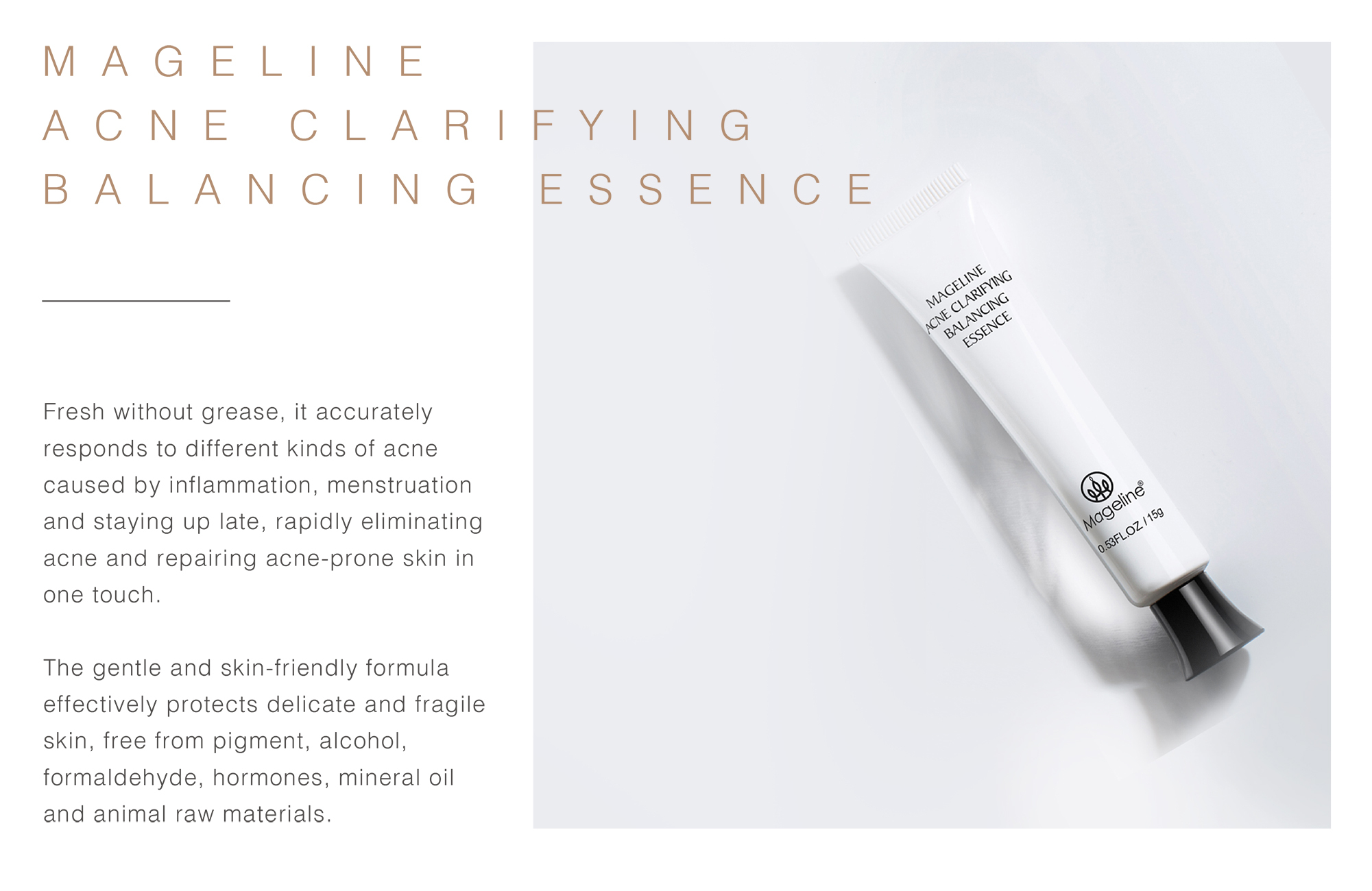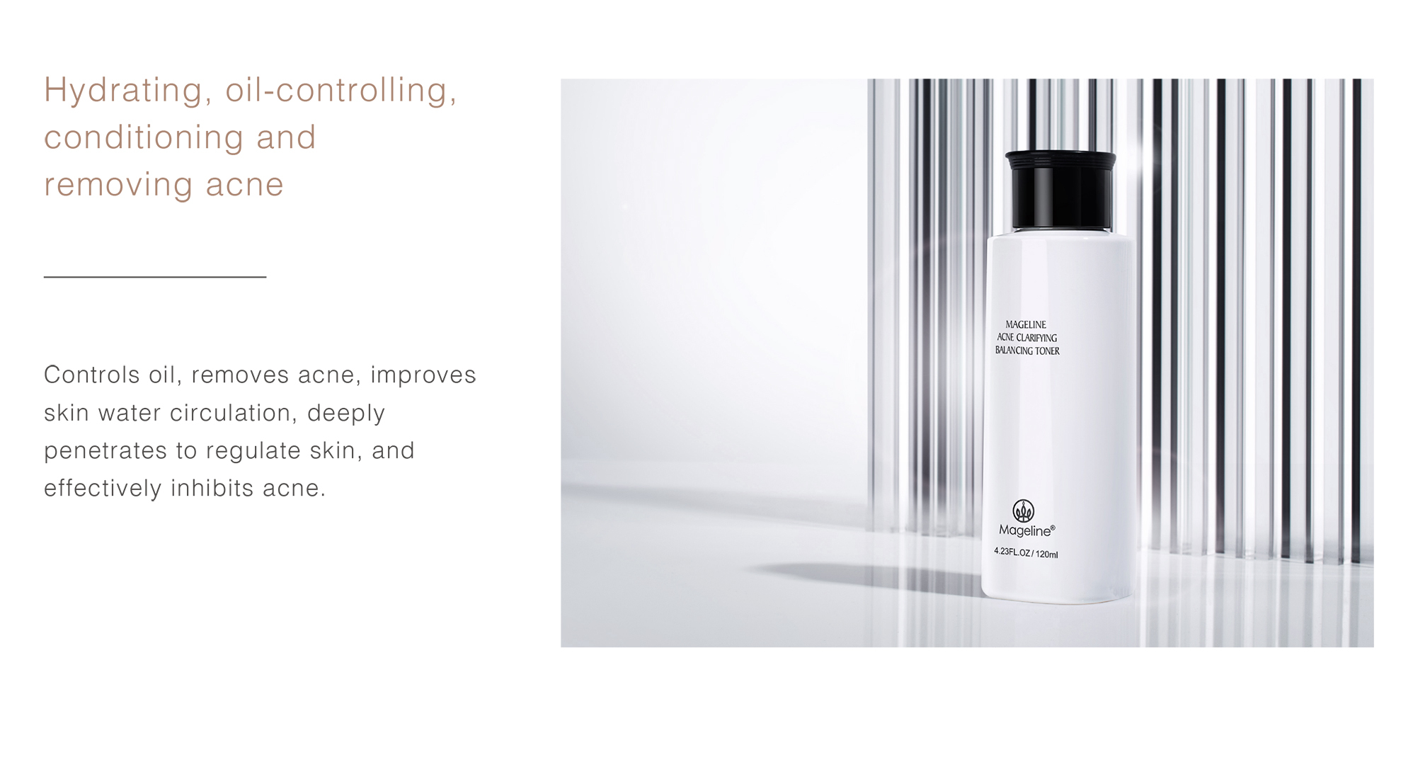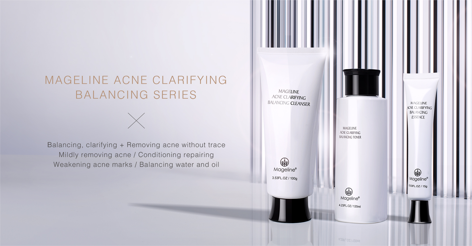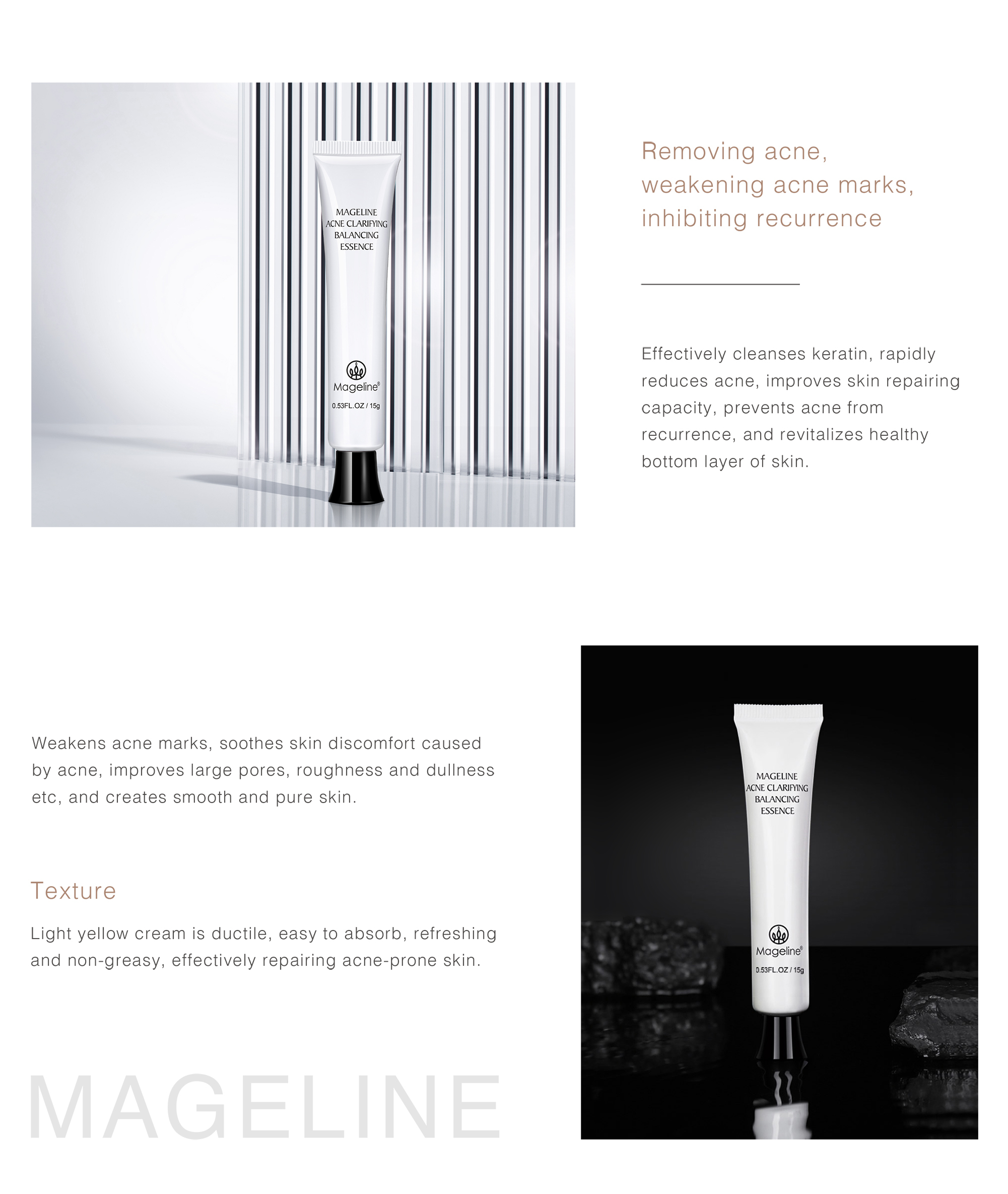 Repeated acne, marks are difficult to disappear? Mageline's "Acne clarifying balancing"skin care can help you smooth acne skin with one touch . Mildly clearing acne, conditioning and repairing, diluting acne marks, and balancing oil and water