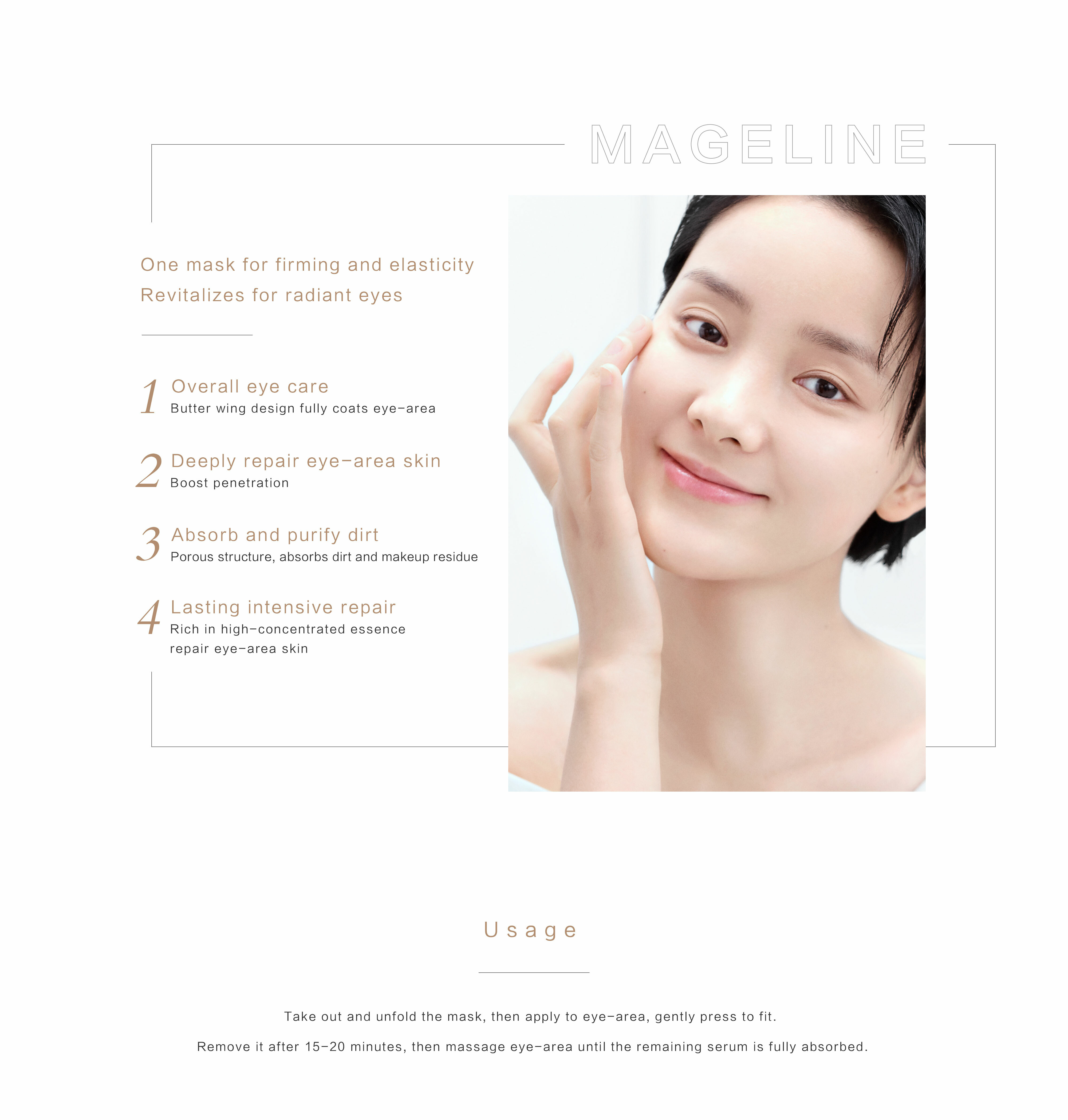 A black technology of nourishing eye mask that intensively repairs skin ,around eyes for charming, radiant and shiny eyes. Light, soft and skin-friendly, the unique butterfly wing shape offers a multidirectional coverage caring your eyes