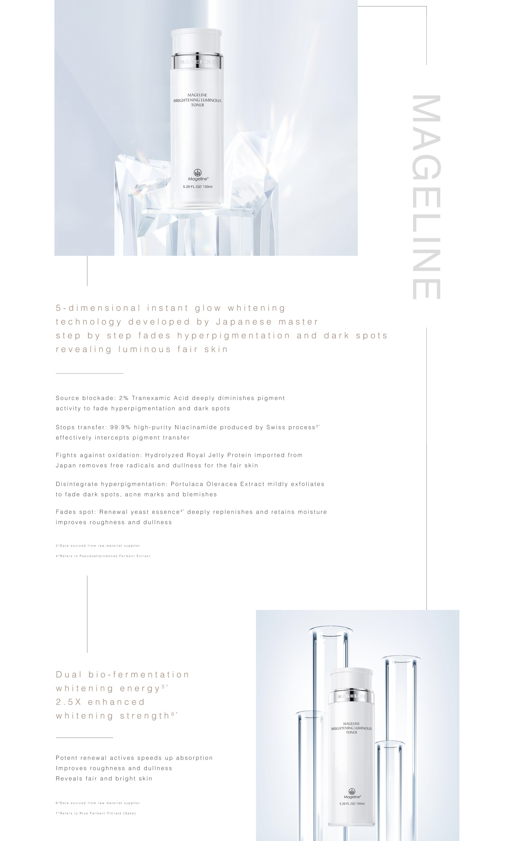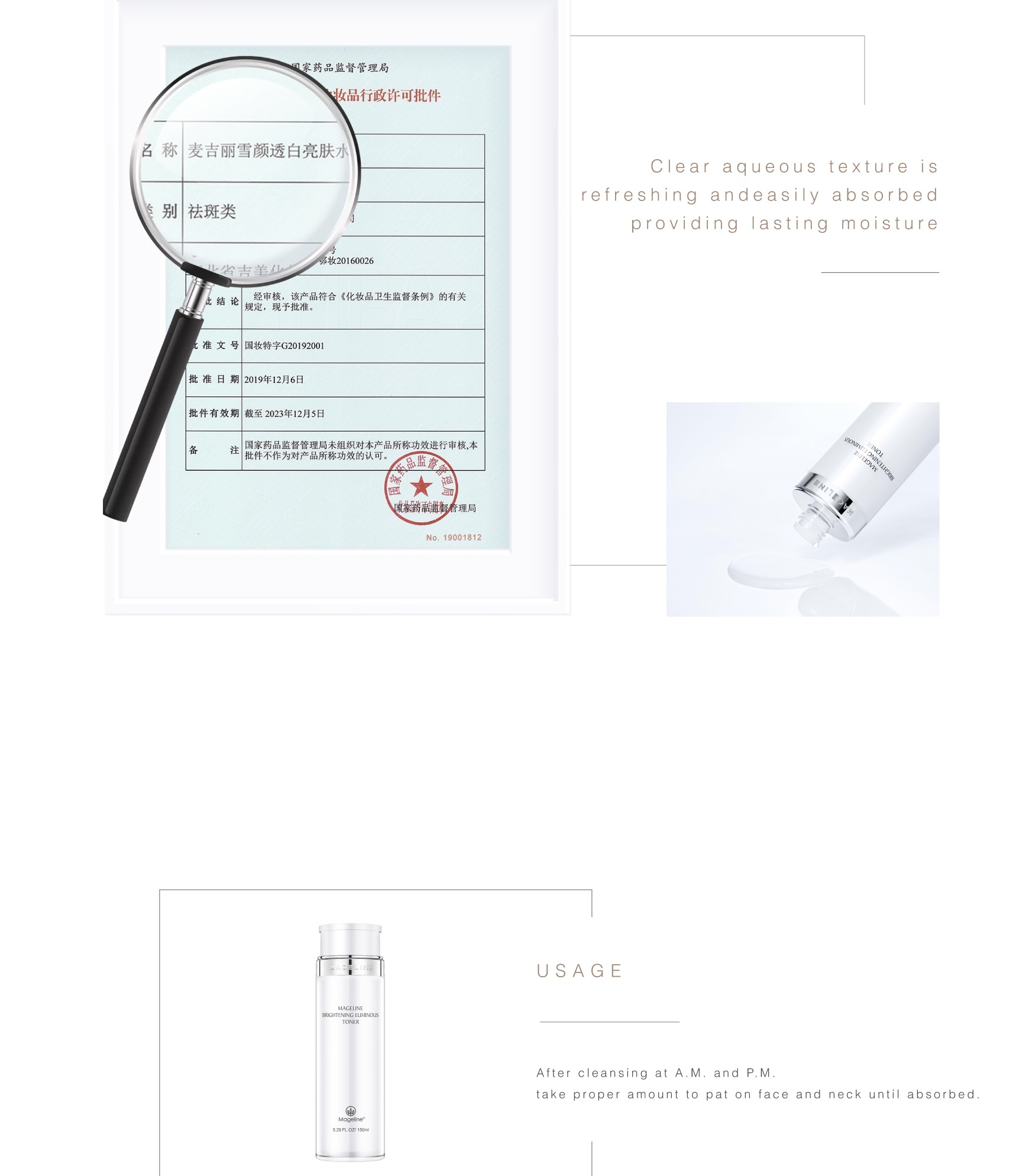 The bio-fermentation technology allows it to gently hydrate, soothe skin, open the skin brightening channel, improve roughness and dullness, and awaken flawless and brighter skin.