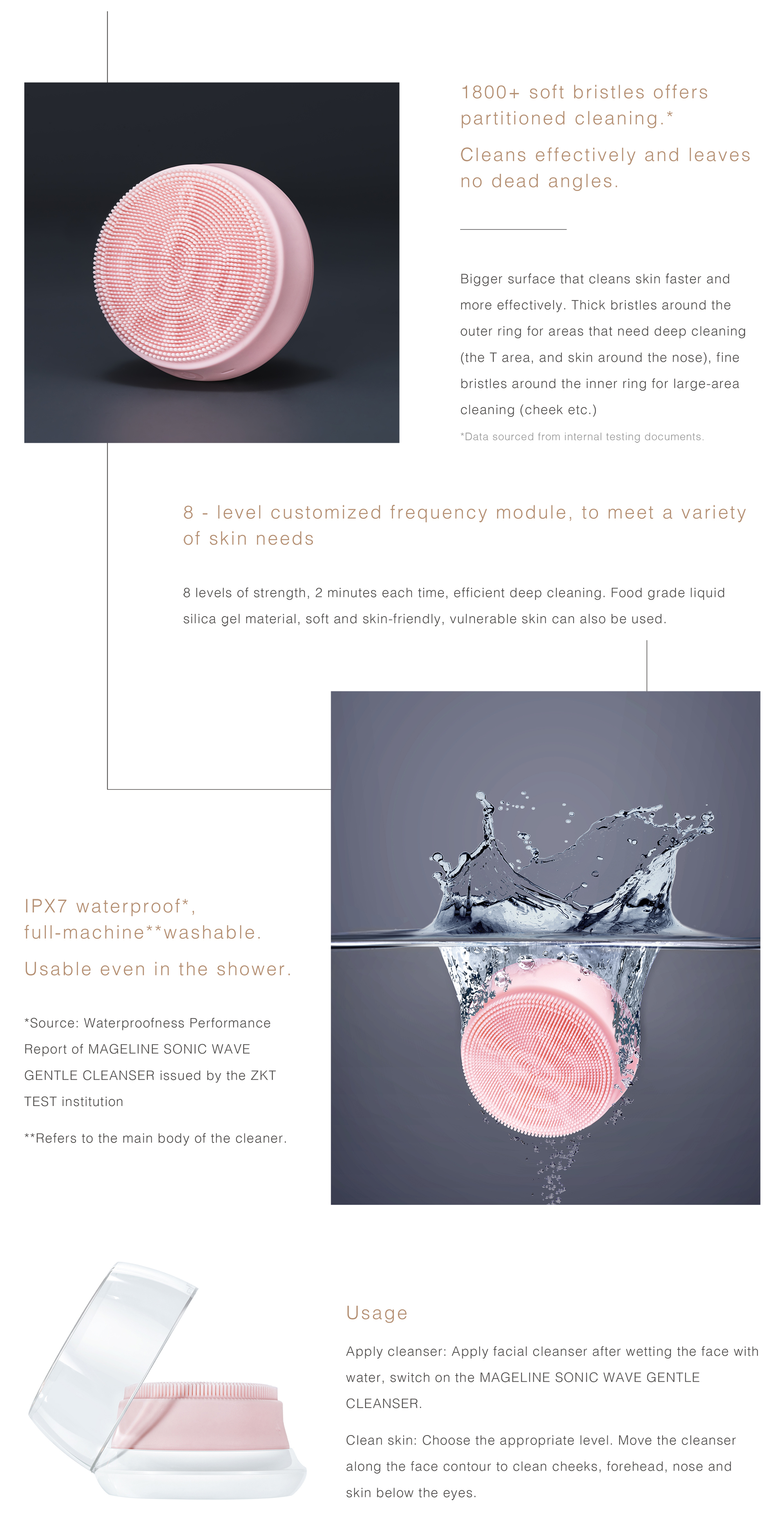 Mageline Sonic Wave Gentle Cleanser Gently cleans away dirt, grease and makeup residues hidden in pores. Opens up channel for more effective absorption of follow-up skin care products.