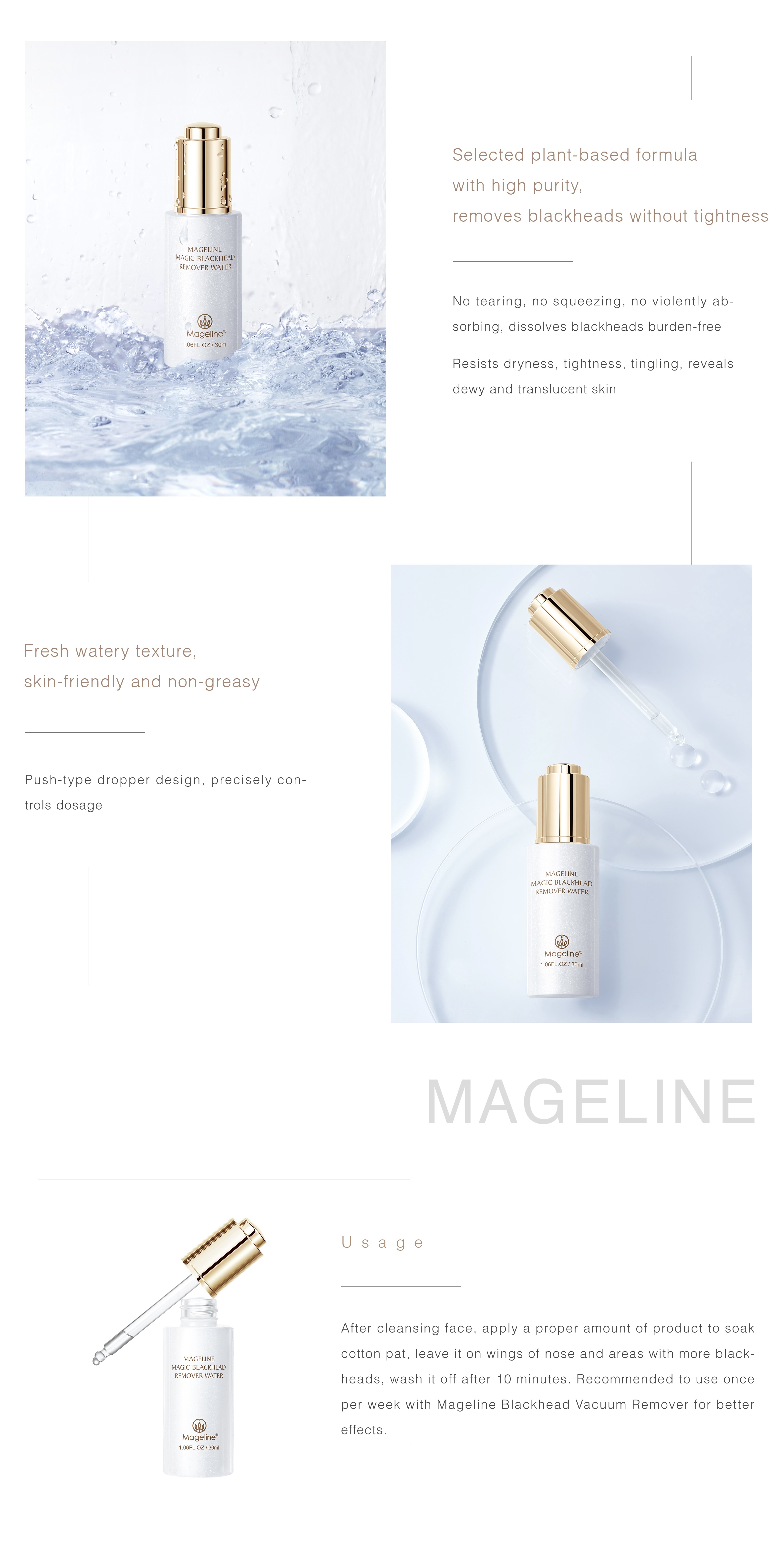 Its small molecule and high permeability formula can deeply dissolve blackheads in massage without squeezing or tearing, soften the dead skin, astringe pores, keep skin fresh and clean and eliminate excessive grease. Instantly dissolving blackhead, purifying, controlling oil sebum.