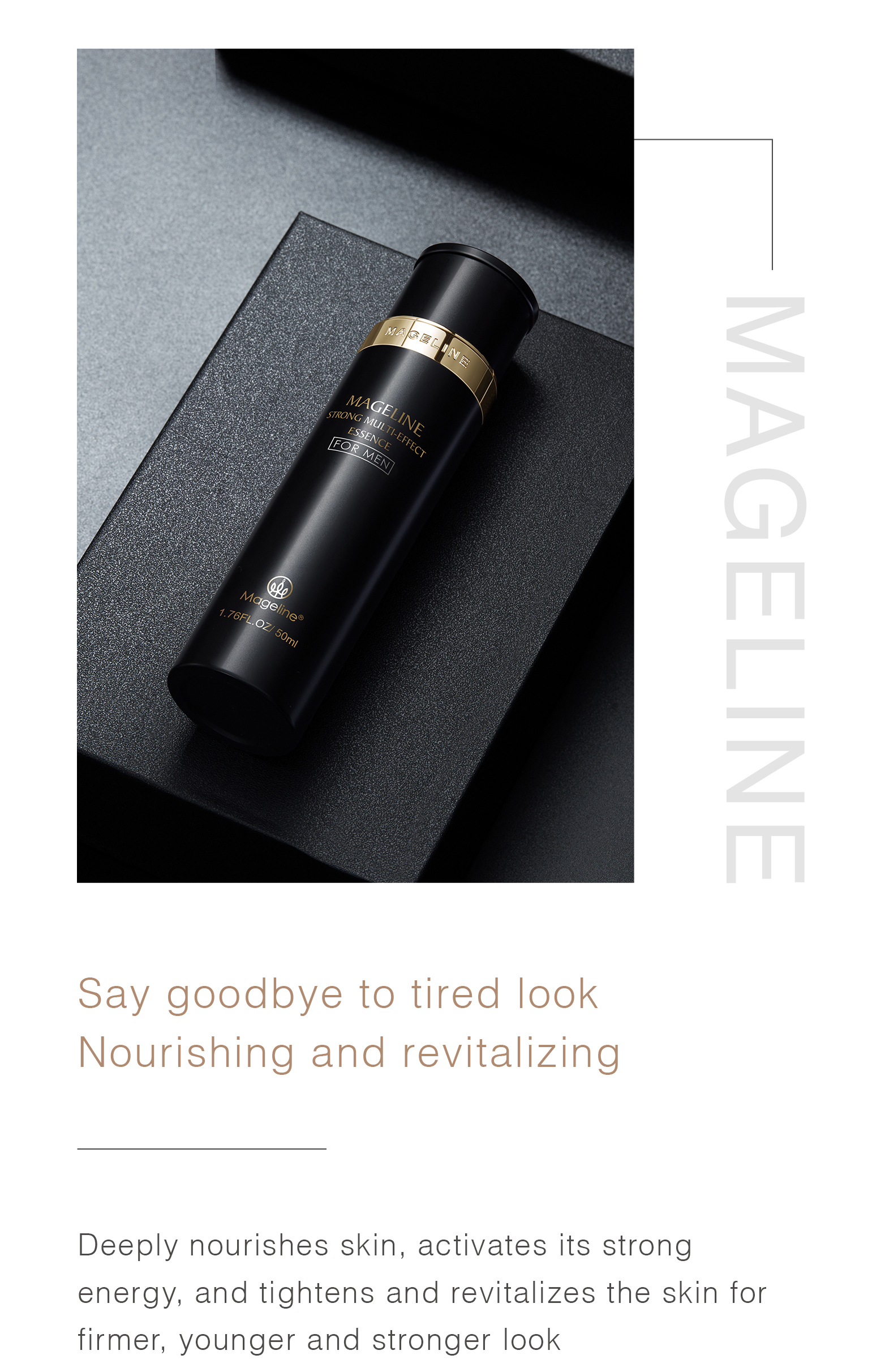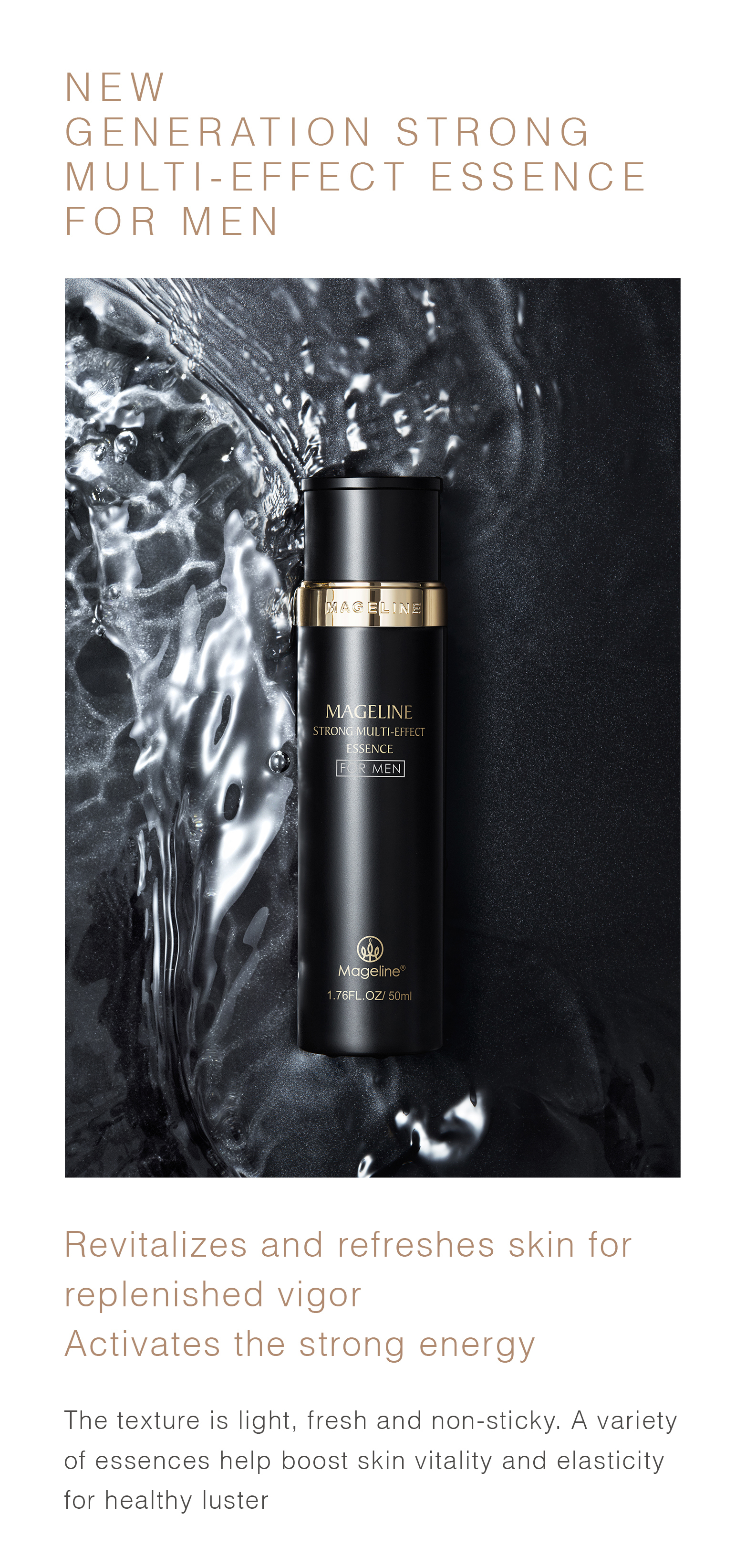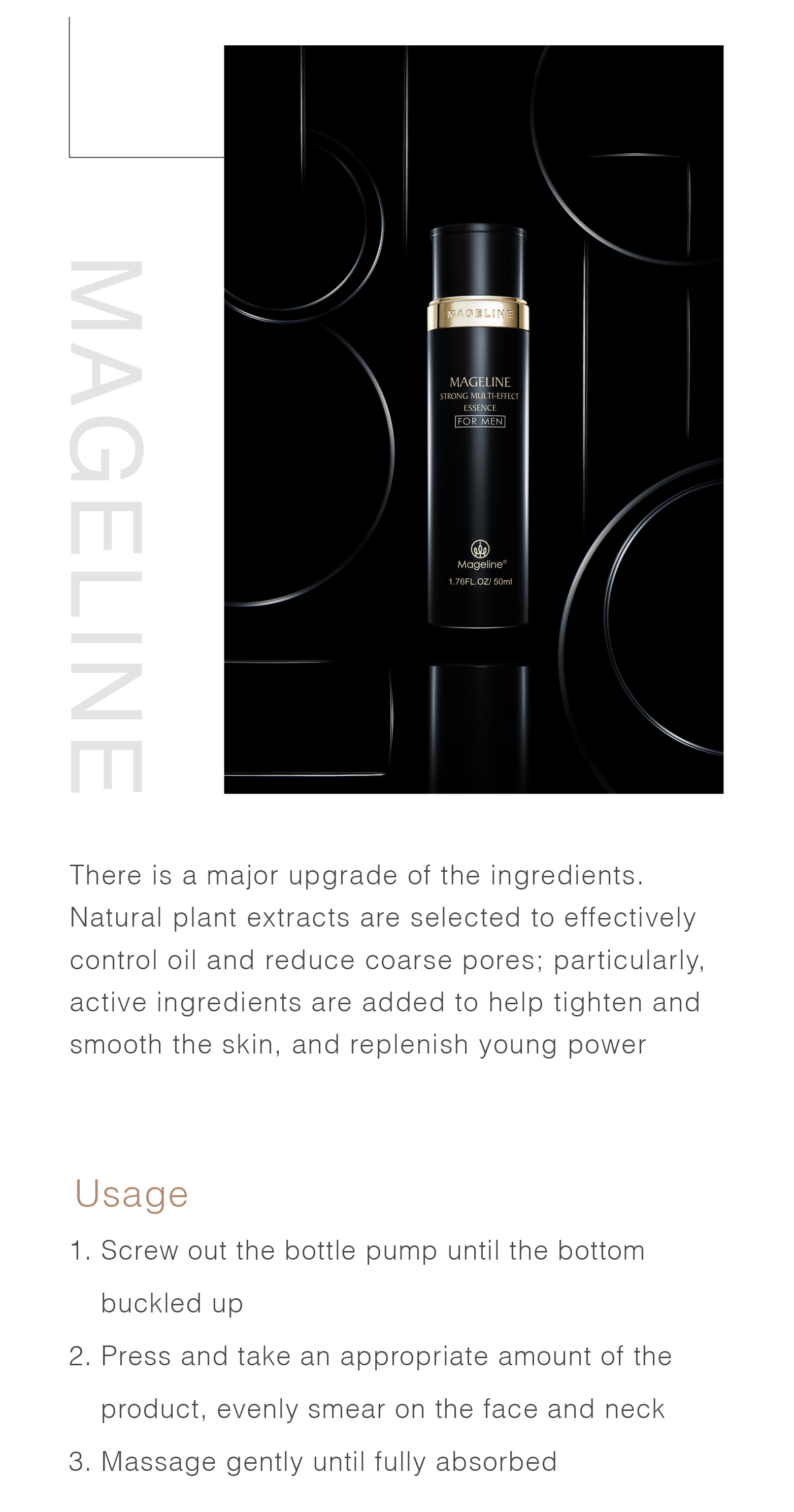 Twist the top of the bottle and take a suitable amount of Mageline Strong Multi-Effect Essence, evenly dab onto face and neck, and gently massage until it is fully absorbed.
