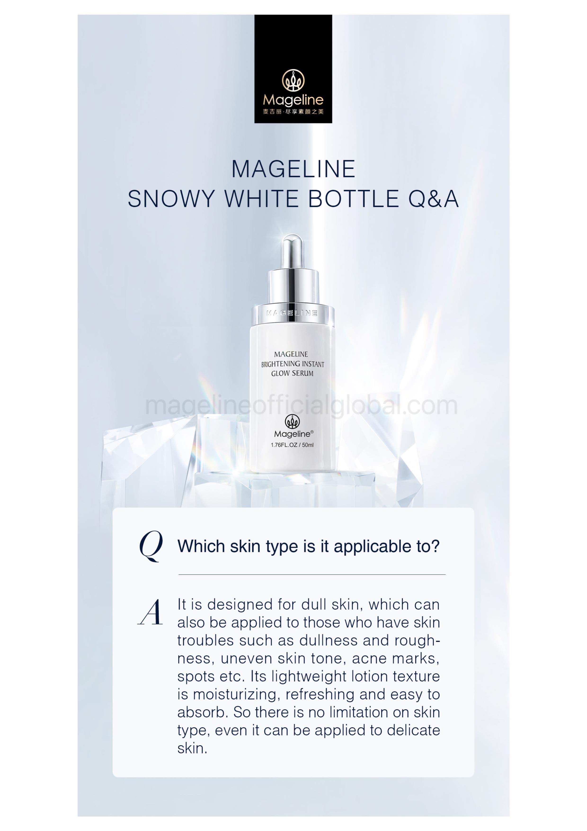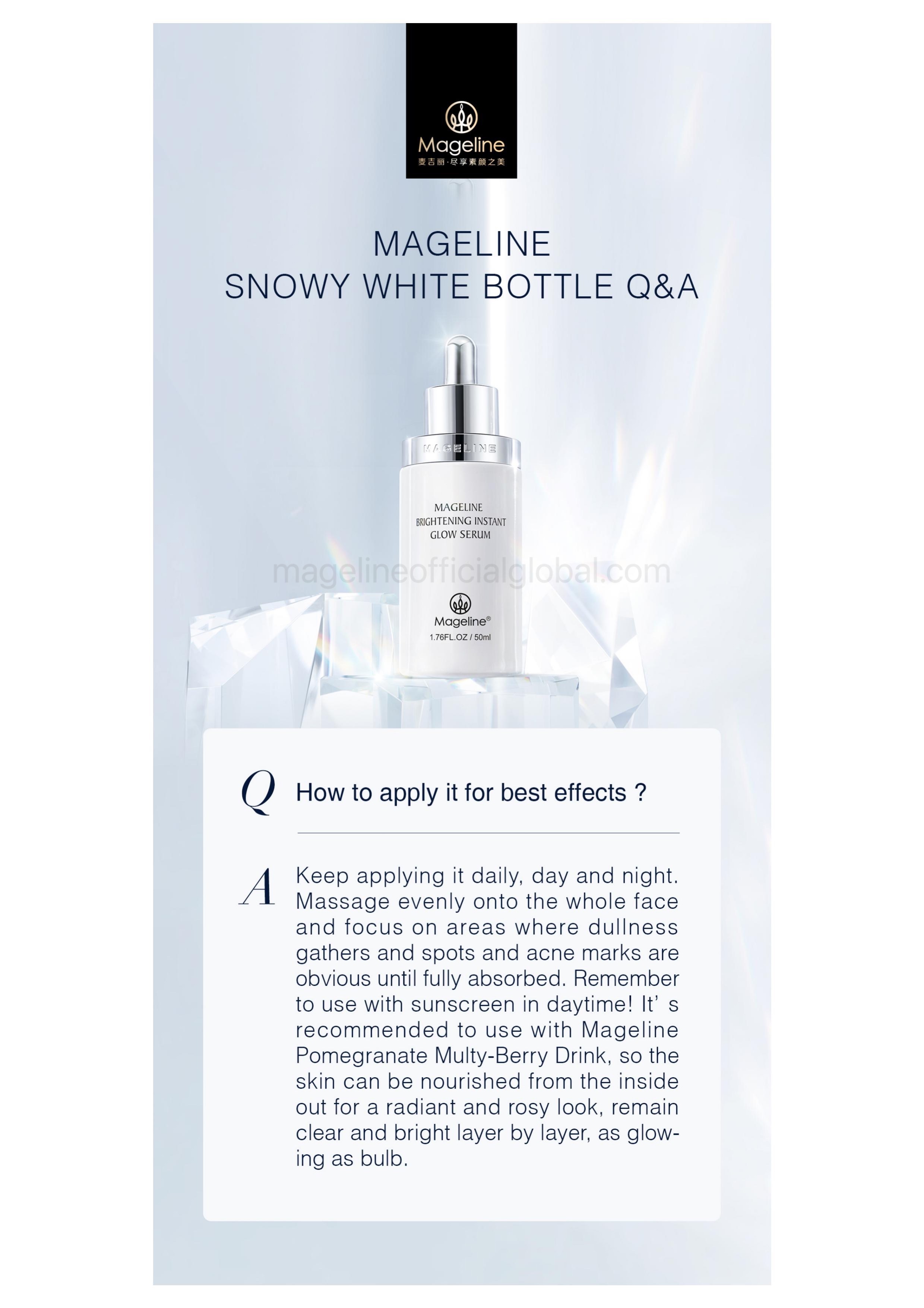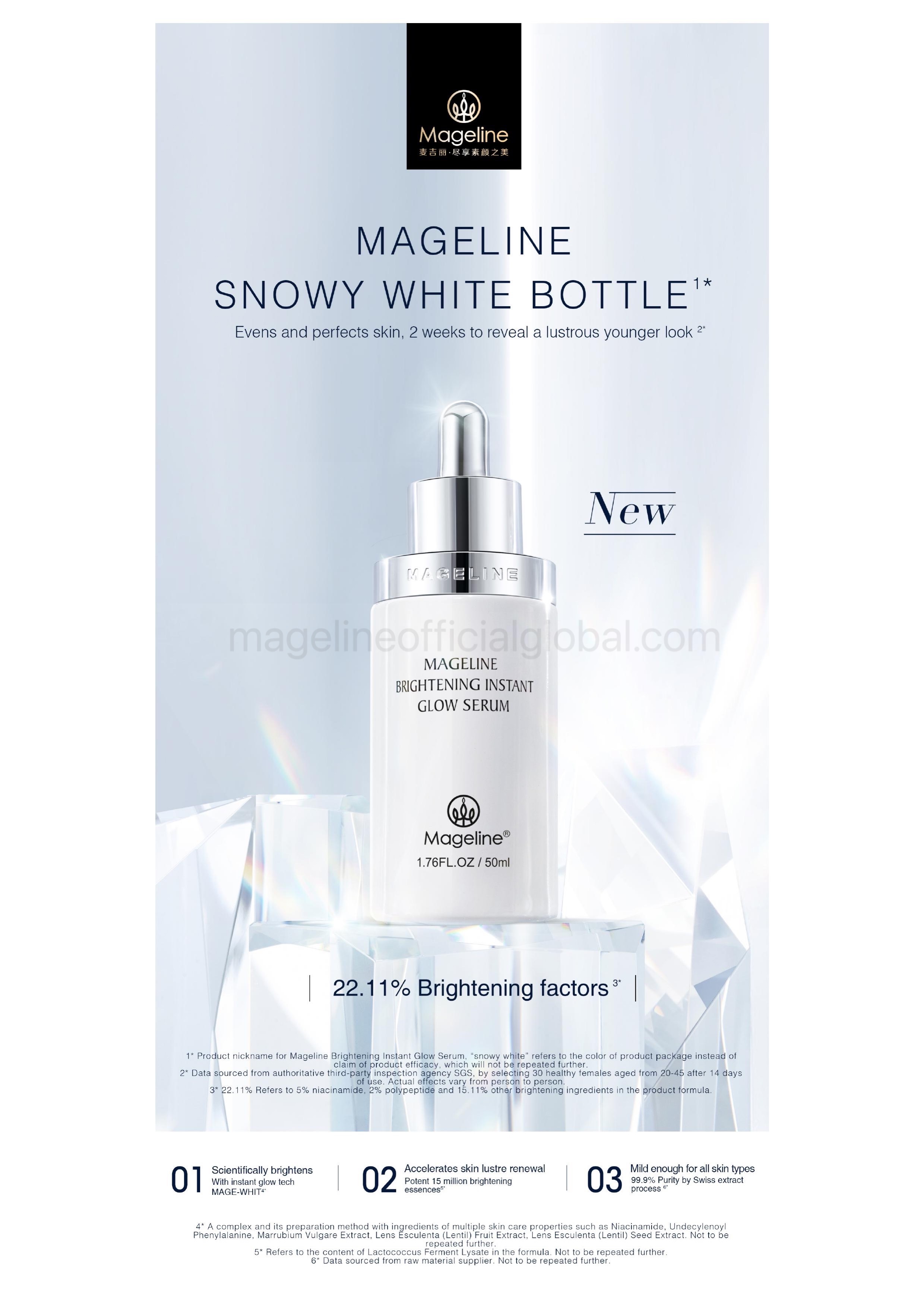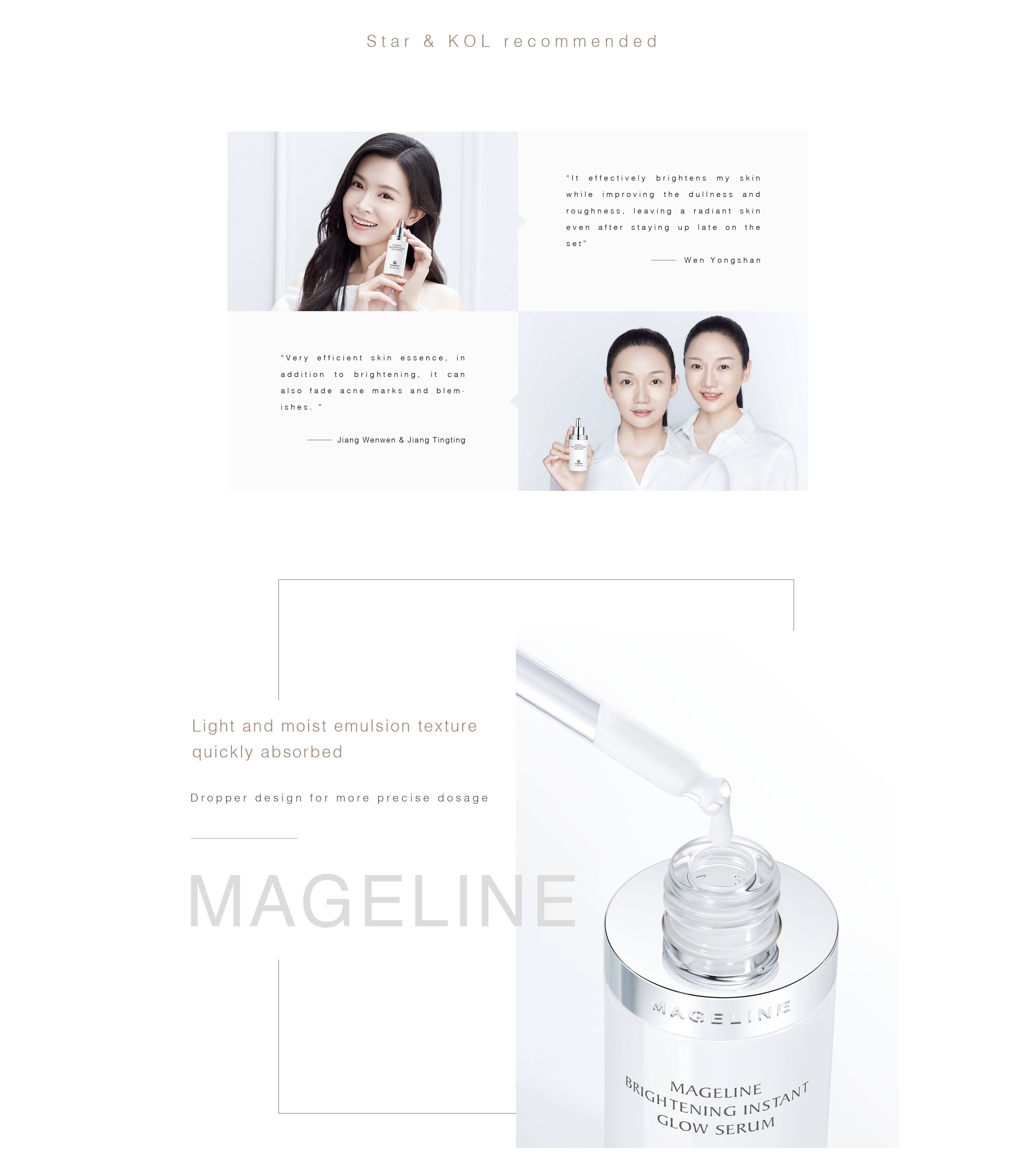 Multiple precious brightening essences provide instant glow to skin while brightening skin from inside out. It helps improve dullness, uneven skin tone and defects while moisturizing skin to promote its self-resistance, leaving skin delicate and supple. Long-term use to reveal skin snowy brightness and vibrancy.
