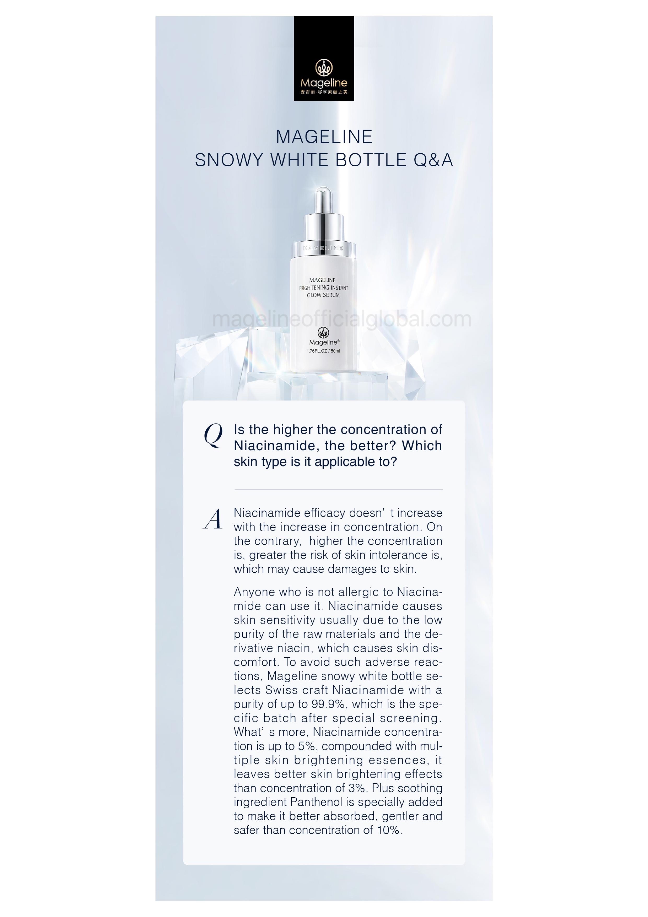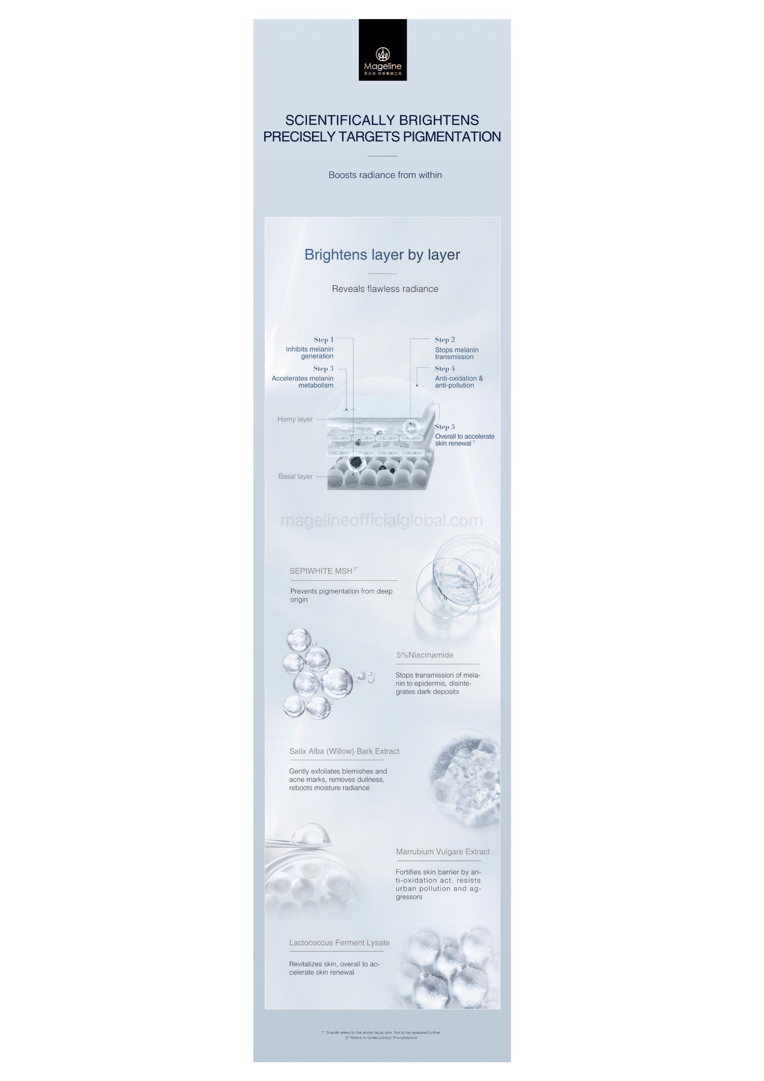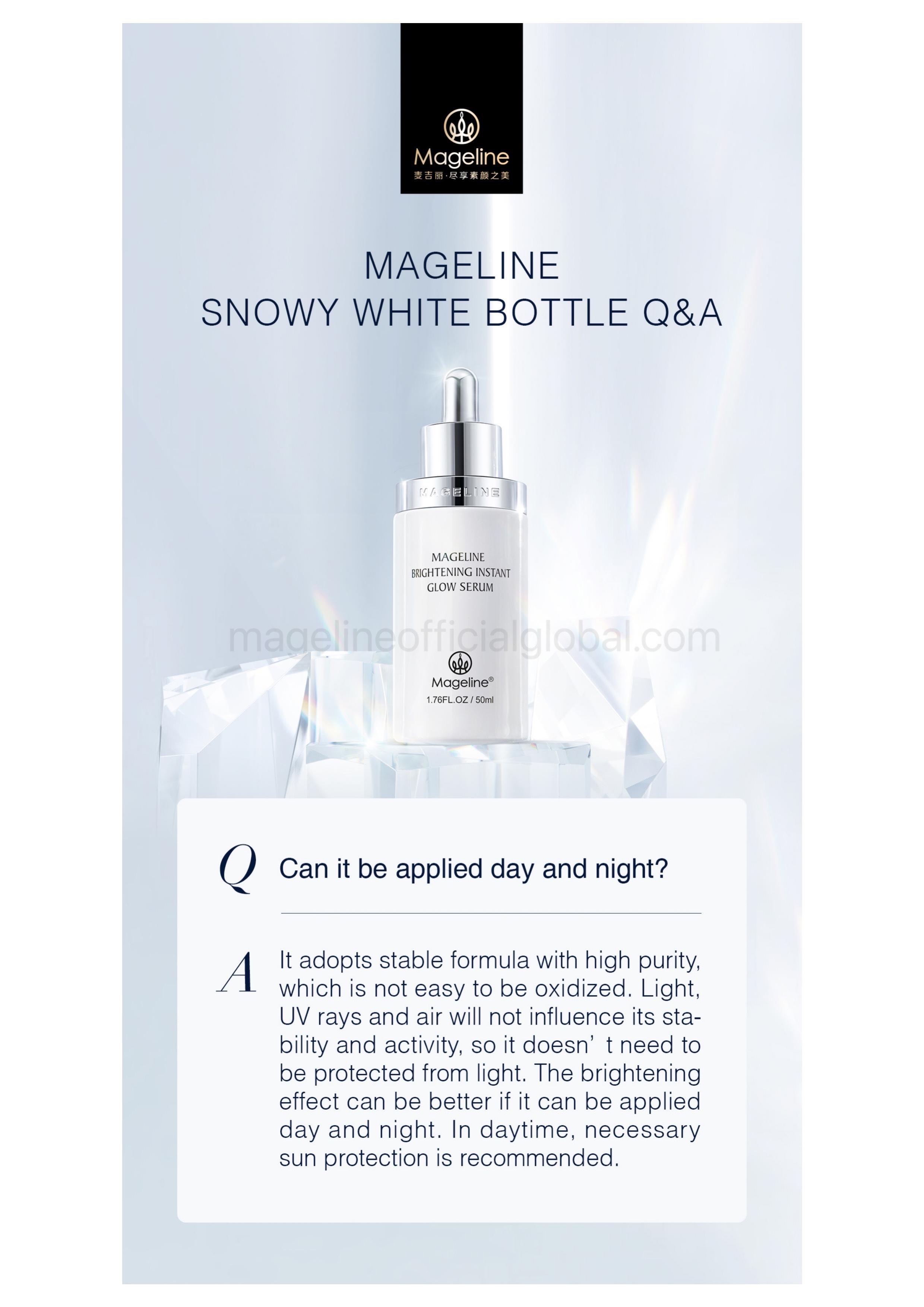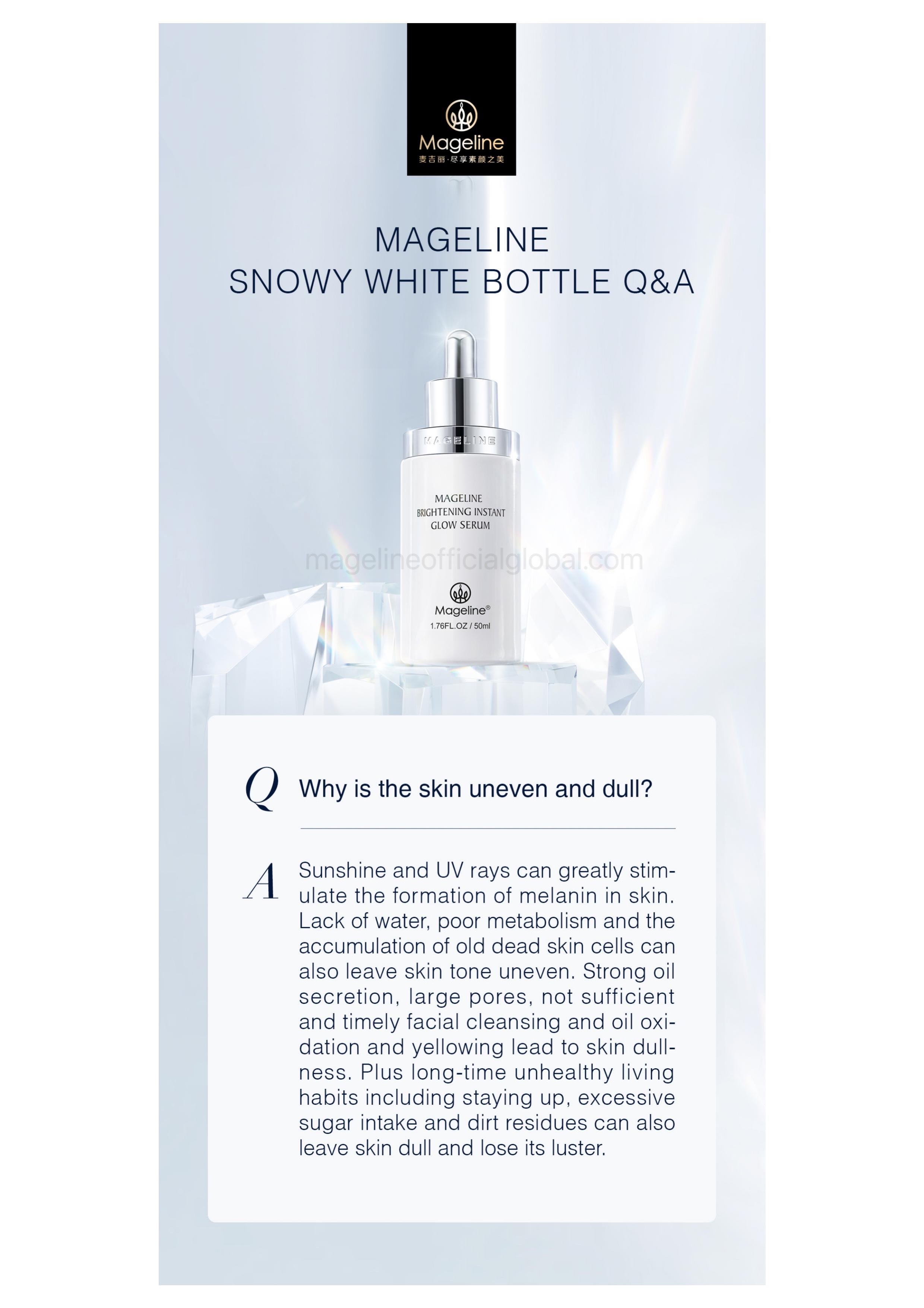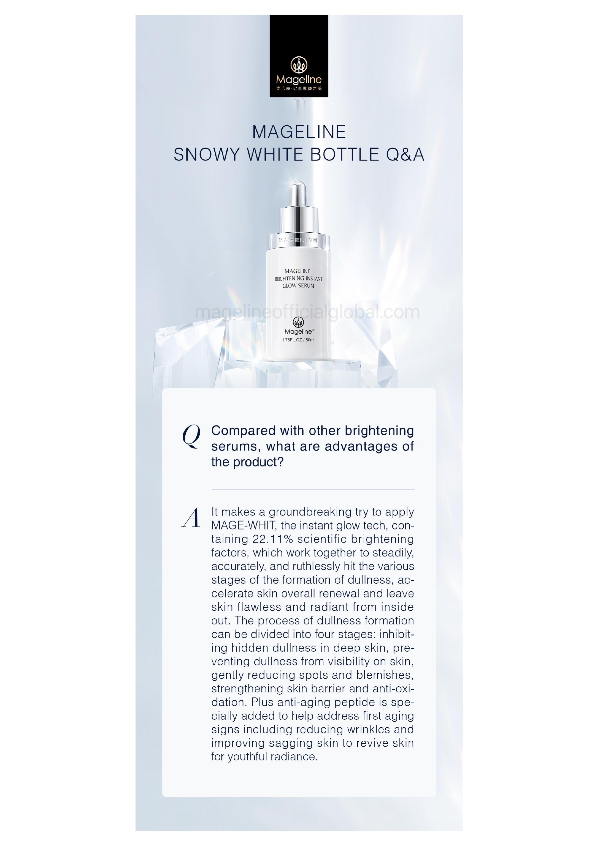 Multiple precious brightening essences provide instant glow to skin while brightening skin from inside out. It helps improve dullness, uneven skin tone and defects while moisturizing skin to promote its self-resistance, leaving skin delicate and supple. Long-term use to reveal skin snowy brightness and vibrancy.
