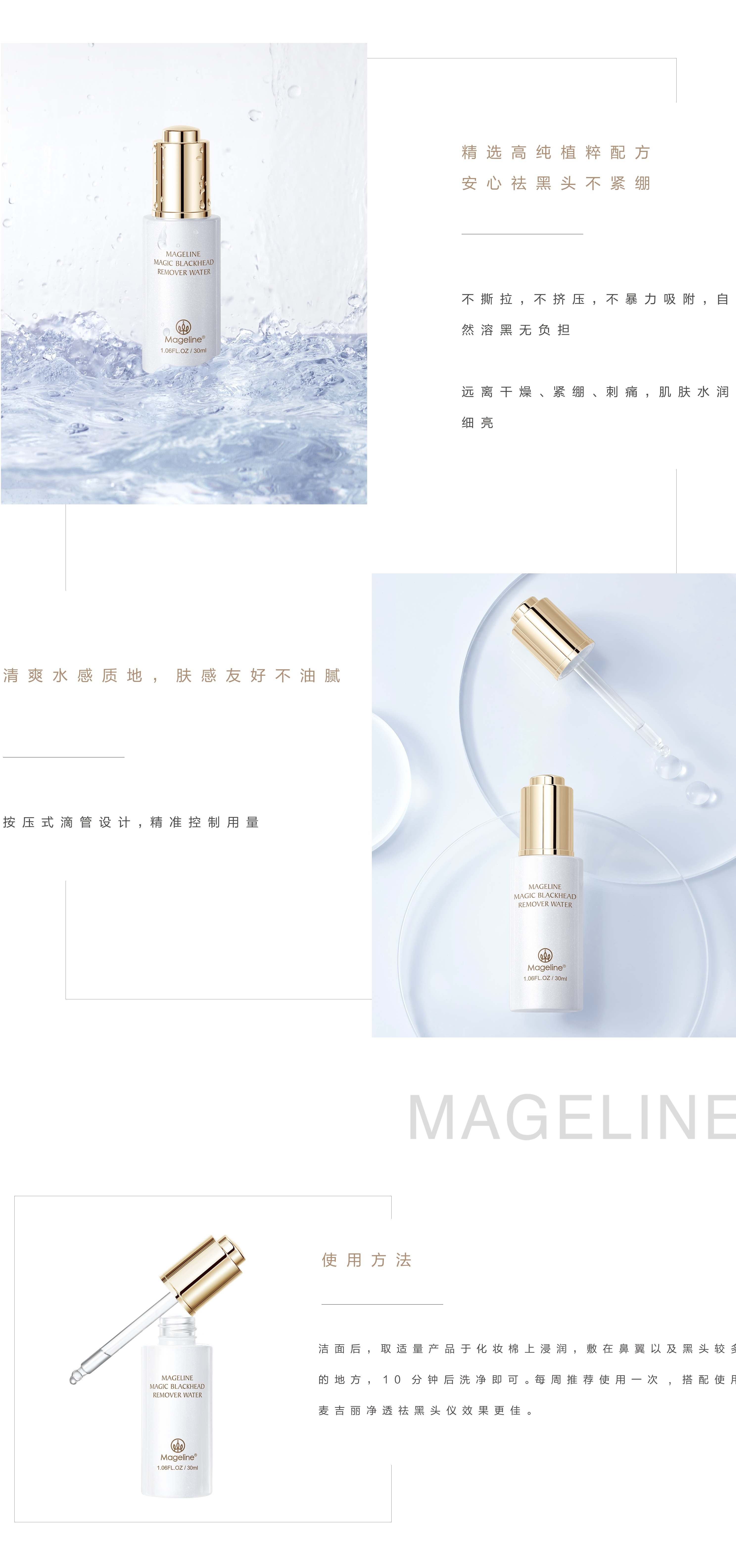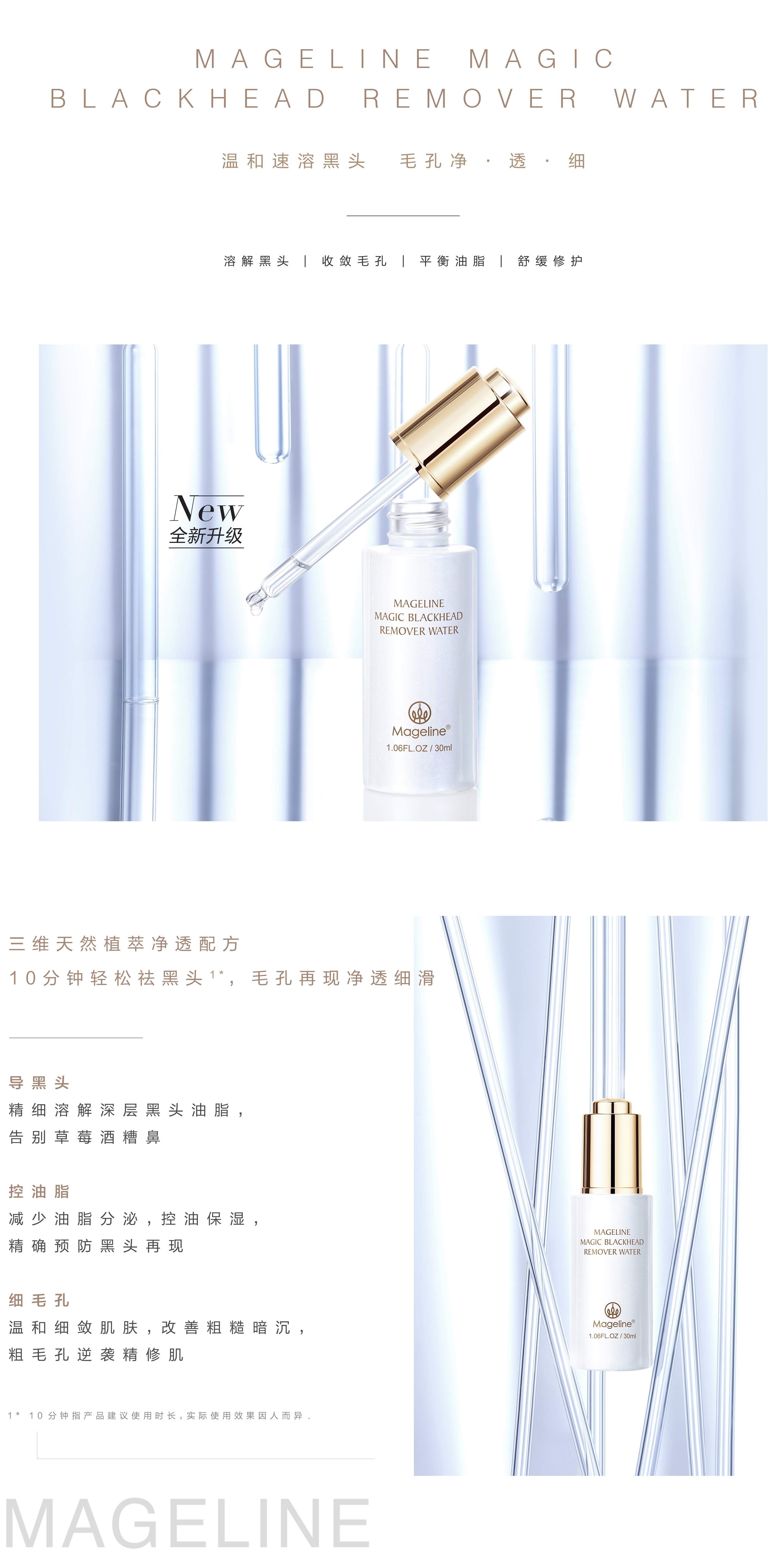 内含高纯度植物萃取精华, 能在按摩吸收的时候深入溶解黑头, 经代谢排出体外, 无需挤, 无需撕拉, 即可让黑头溶解, 采用小分子渗透性配方, 使肌肤死皮软化, 改善黑头, 闭口粉刺等肌肤问题, 收敛毛孔, 保持清爽洁净, 杜绝油光。