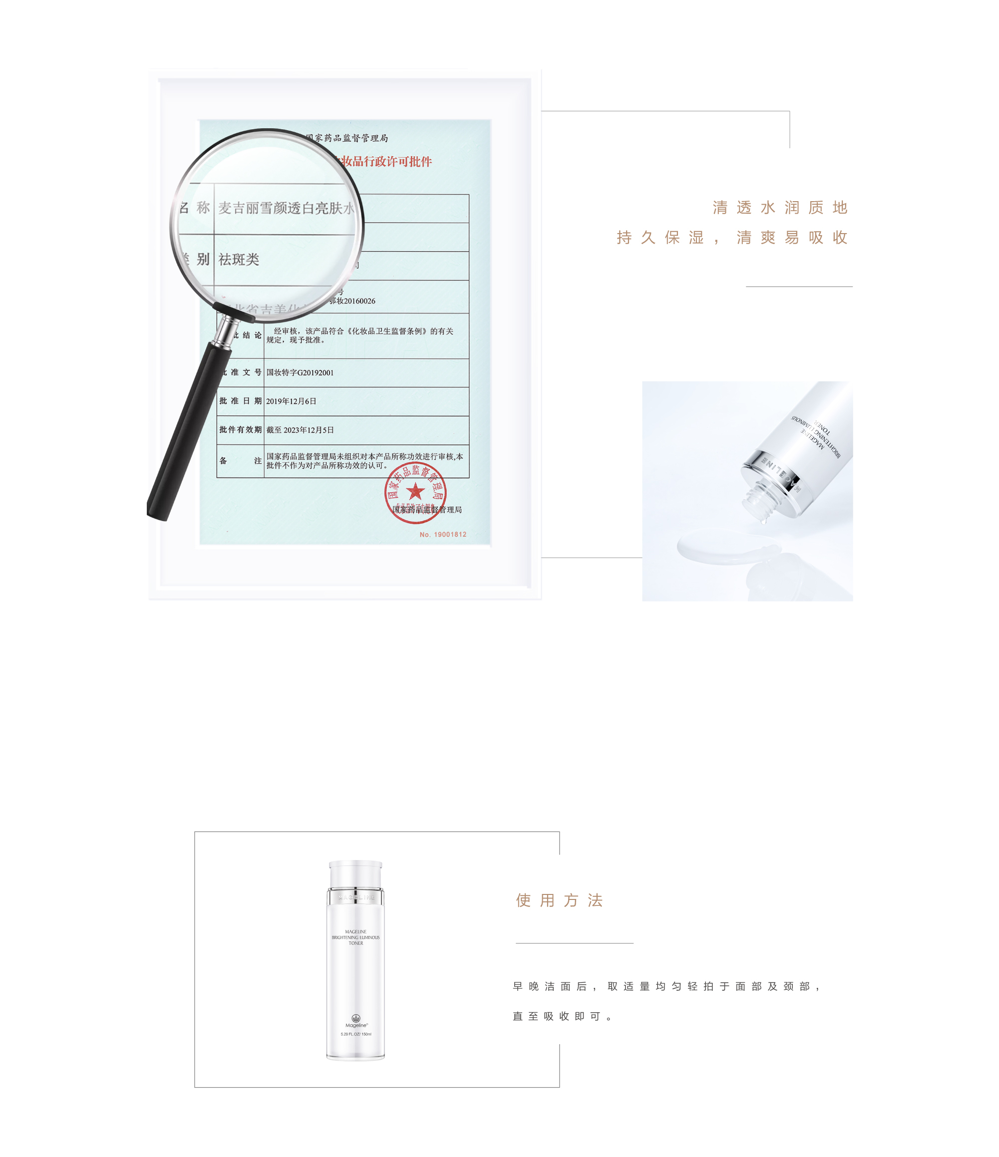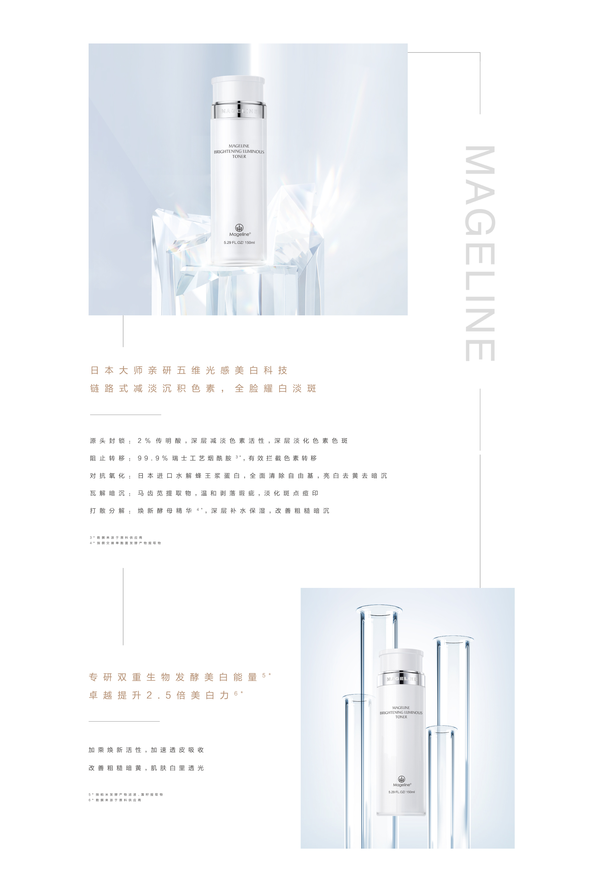 革命性美白科技, 精准淡斑祛斑,有效抑制黑色素生成, 深层击退黑色素, 修护暗哑干燥, 莹润滋养好气色. 历时数年研发,净化肌底,提亮肤色,采用多重修护技术,六大对策全方位美白. 活化表皮细胞, 让肌肤恢复到健康的新陈代谢功能, 促进已生成的黑色素排出体外, 从肌底改善肌肤粗糙暗沉,令肌肤匀亮通透. 为肌肤温和补水的同时, 舒缓肌肤, 祛黄淡黑斑, 紧致抗皱, 提亮肤色, 采用生物发酵技术, 为肌肤注入营养水分, 有效改善粗糙暗沉肤质, 深层唤醒无瑕透亮美肌, 日复一日, 肌肤更加纯净细腻.