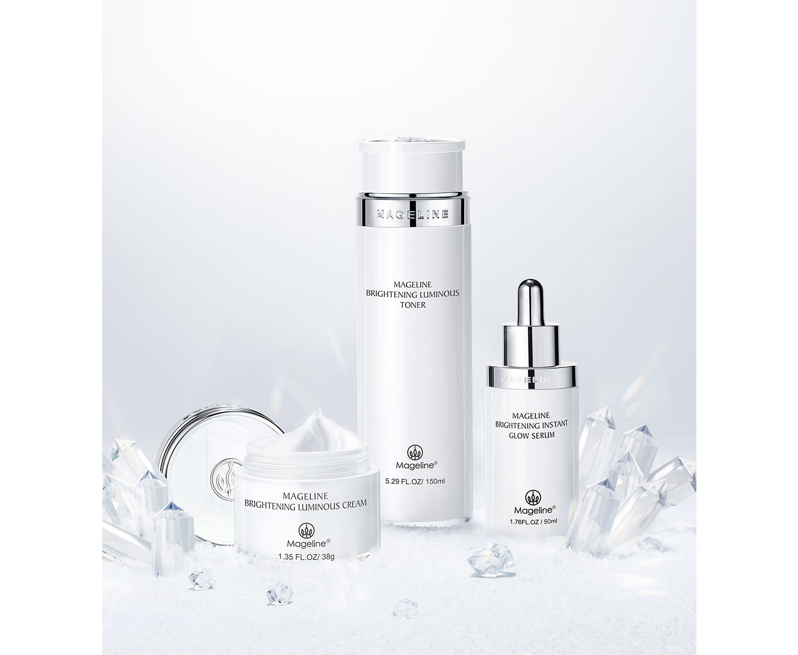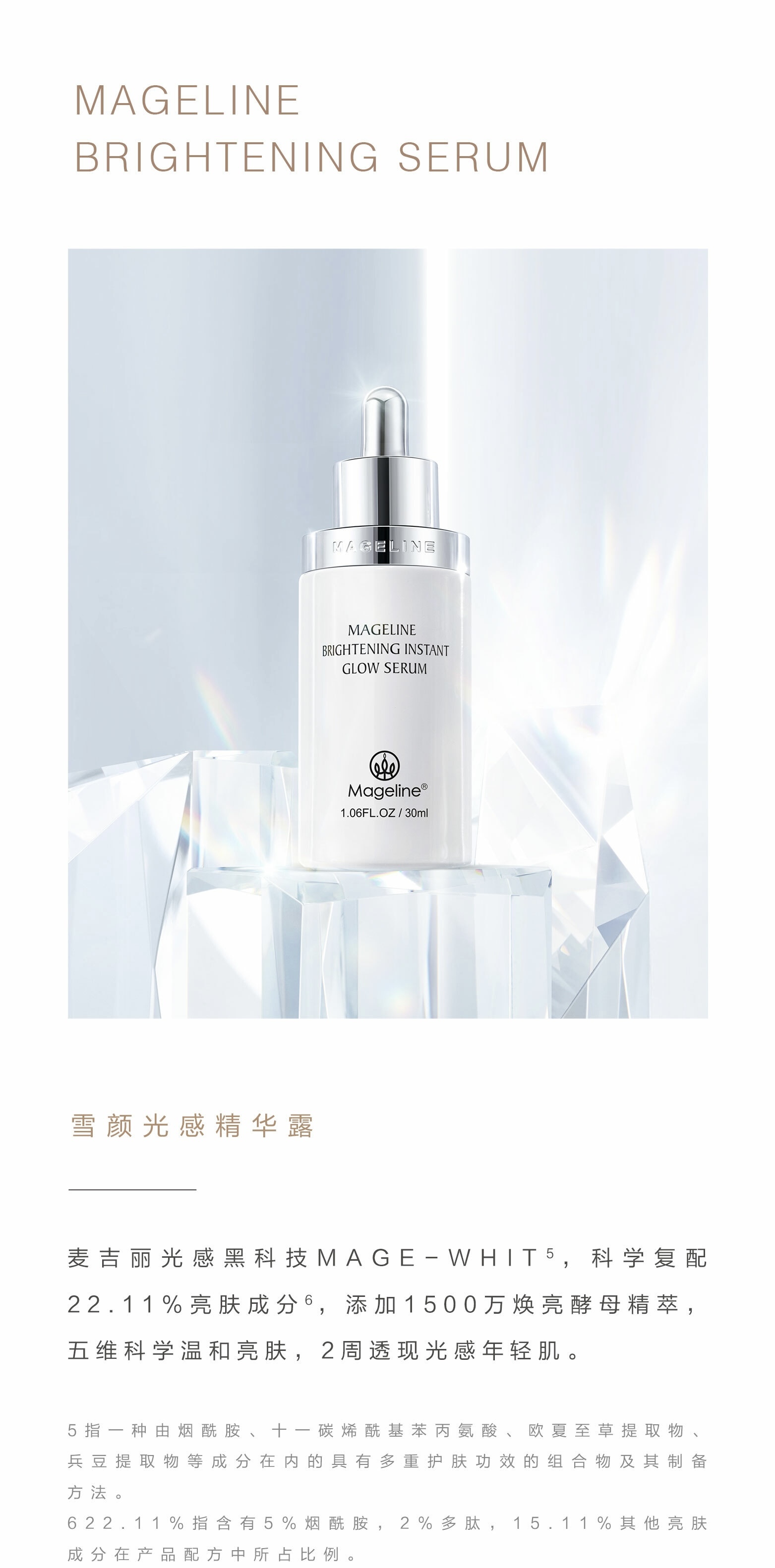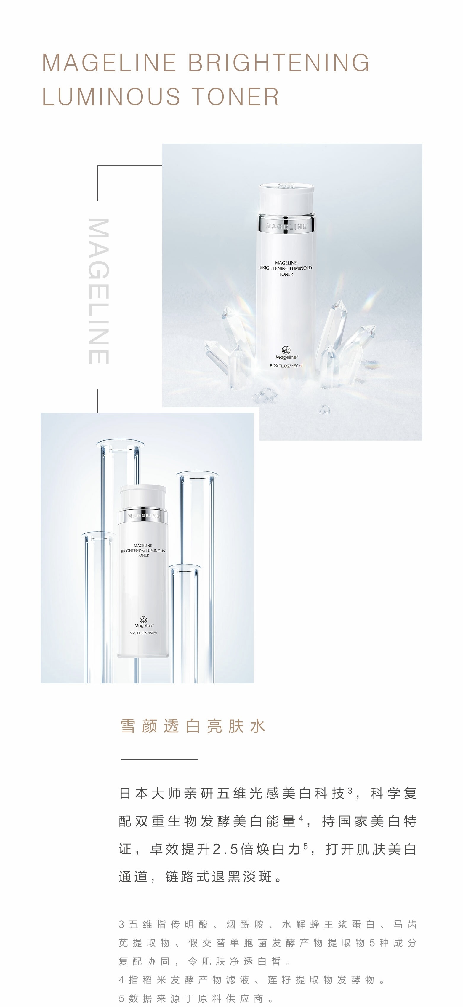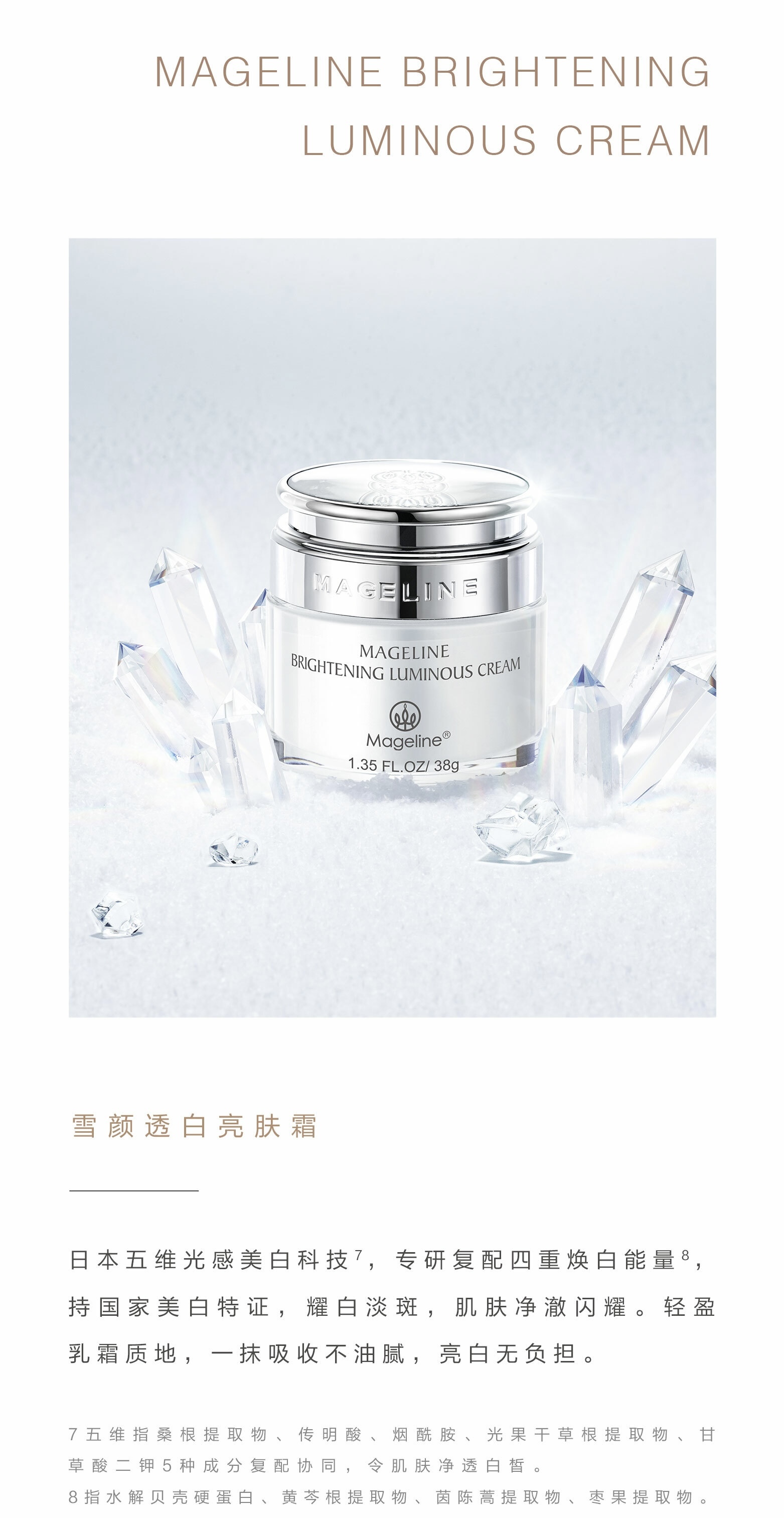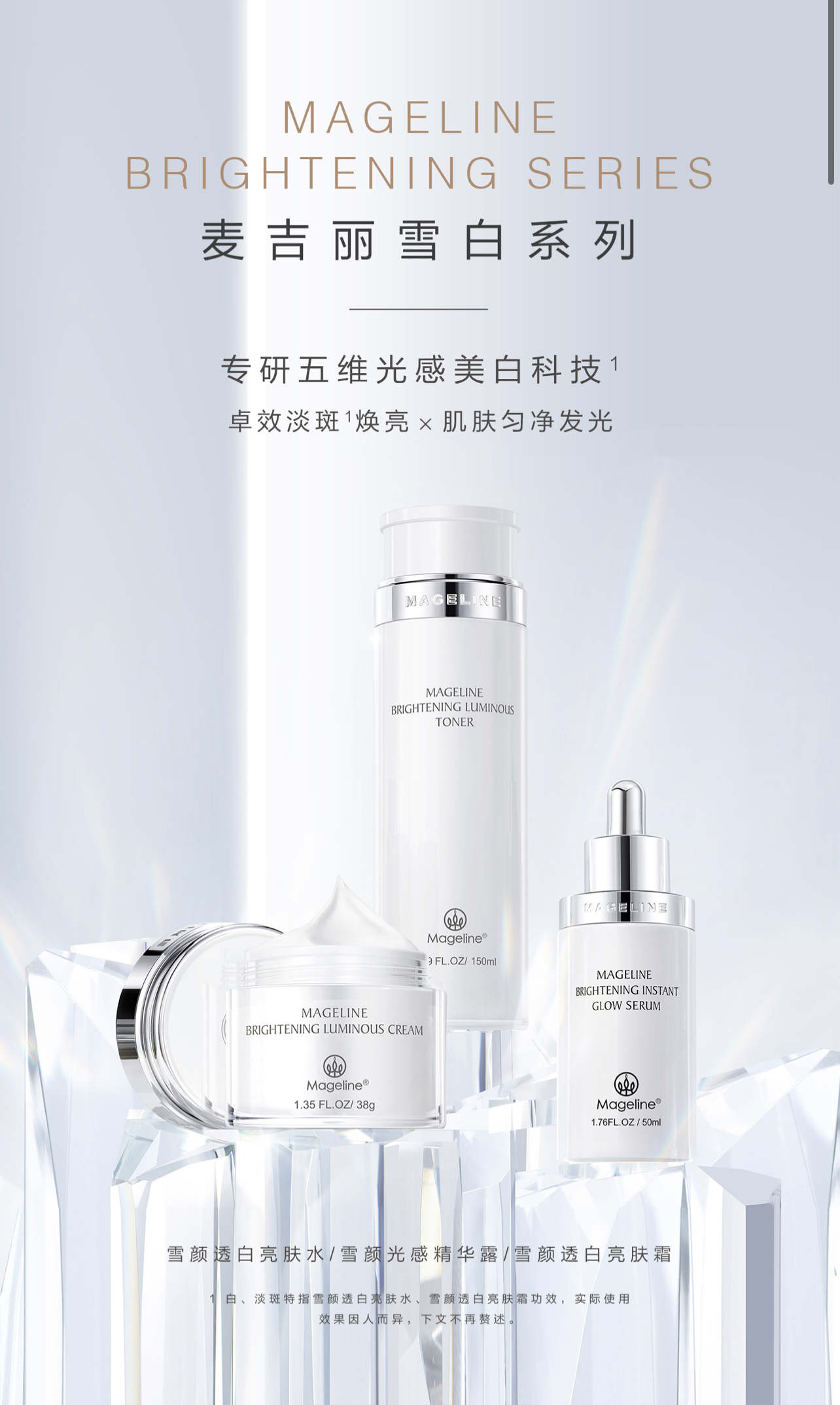 日本梁木利男博士匠心之作, 麦吉丽雪颜晶透三部曲, 革命性美白科技, 精准淡斑祛斑,有效抑制黑色素生成, 深层击退黑色素, 修护暗哑干燥, 莹润滋养好气色. 历时数年研发,净化肌底,提亮肤色,采用多重修护技术,六大对策全方位美白. 活化表皮细胞, 让肌肤恢复到健康的新陈代谢功能, 促进已生成的黑色素排出体外, 从肌底改善肌肤粗糙暗沉,令肌肤匀亮通透. 为肌肤温和补水的同时, 舒缓肌肤, 祛黄淡黑斑, 紧致抗皱, 提亮肤色,