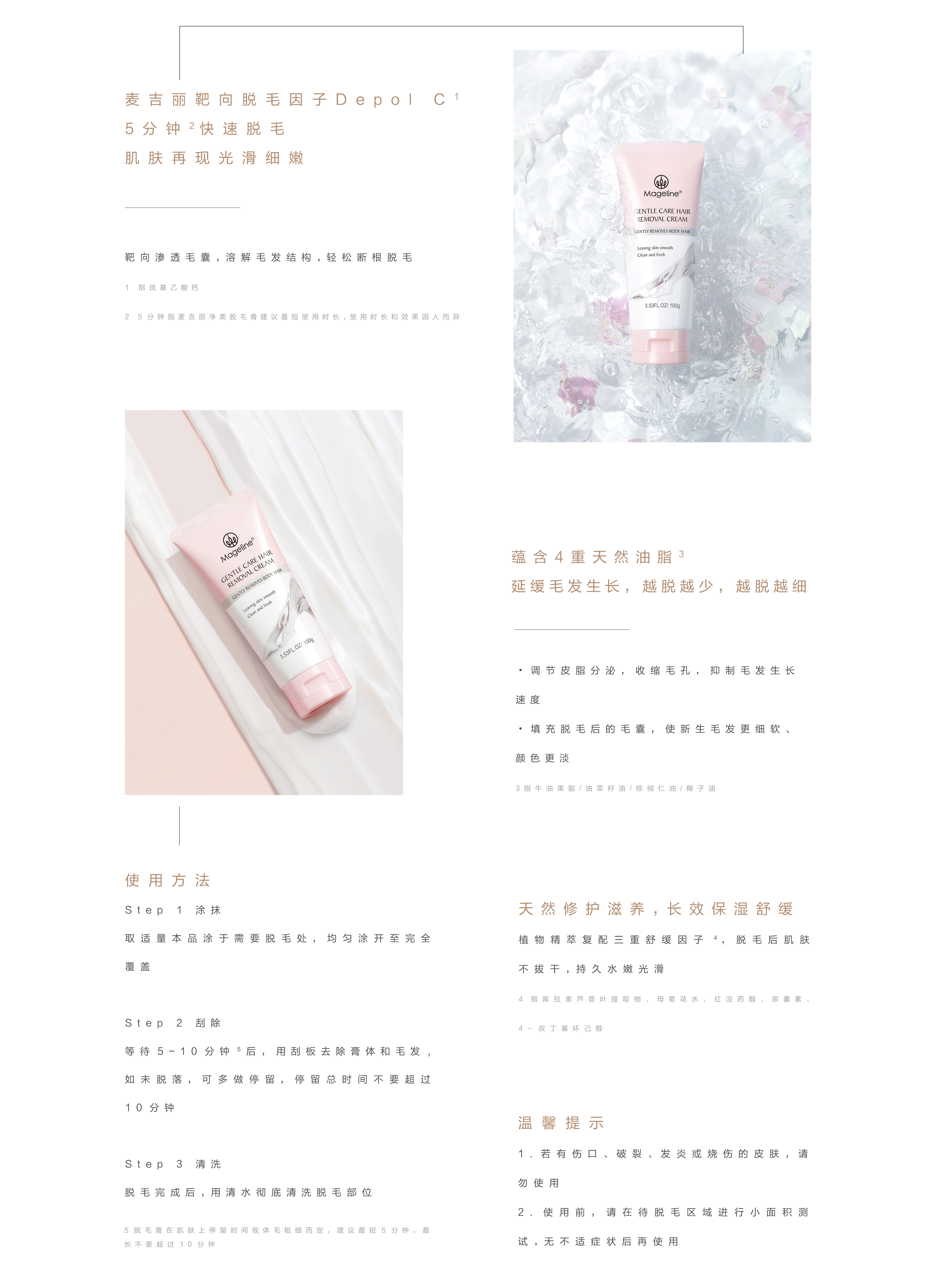 尽享丝滑美肌创新养肤级脱毛膏,靶向轻松脱净,肌肤光洁嫩滑深层快速脱毛,便捷元痛更净澈有效延缓生长,告别反复脱毛天然植萃滋养,持久保湿修护,安全亲肤配方