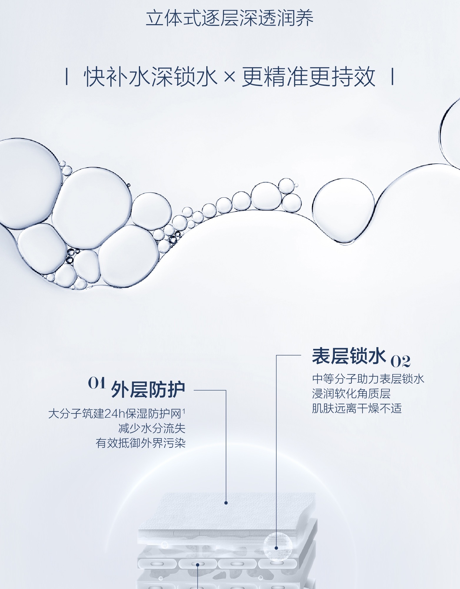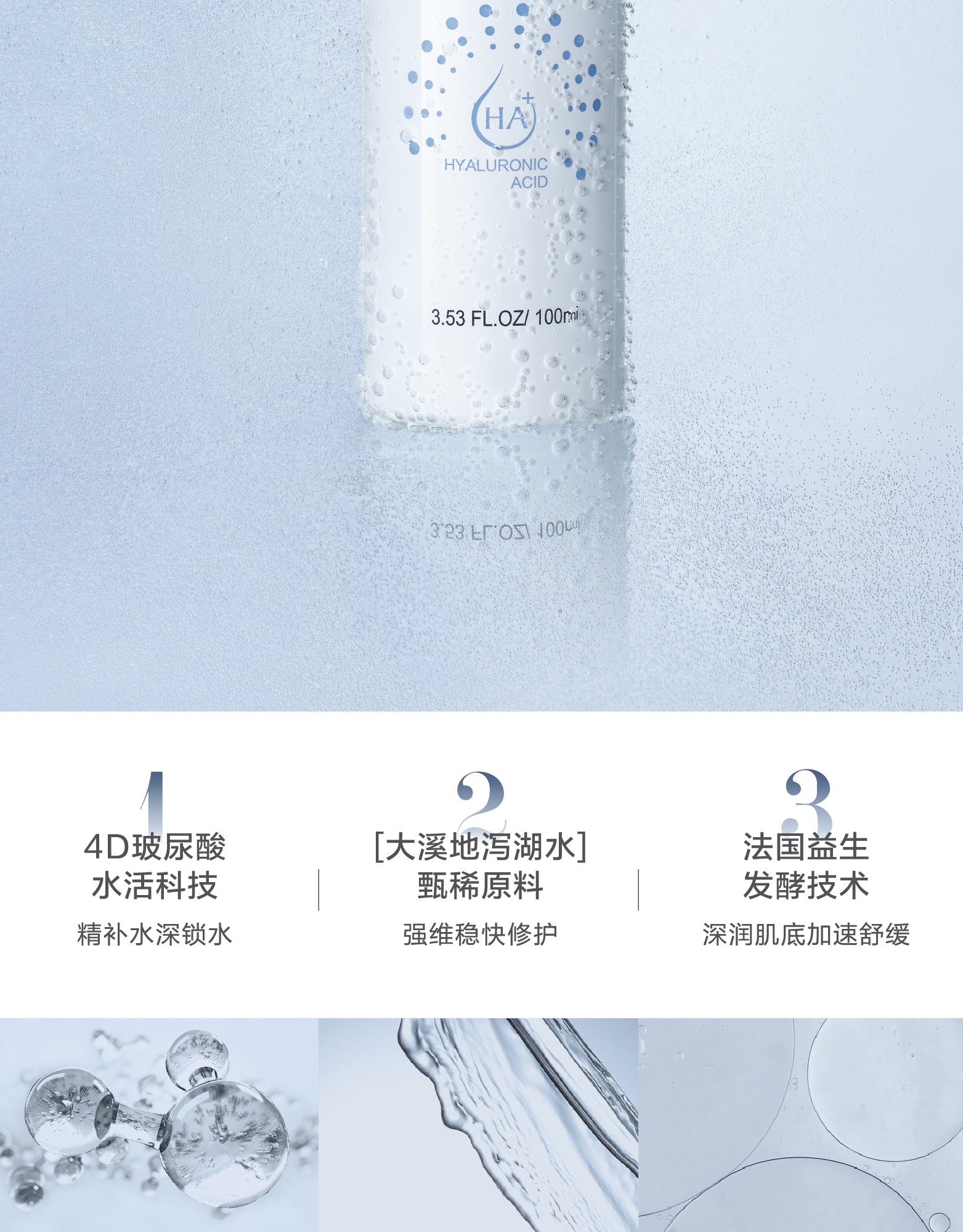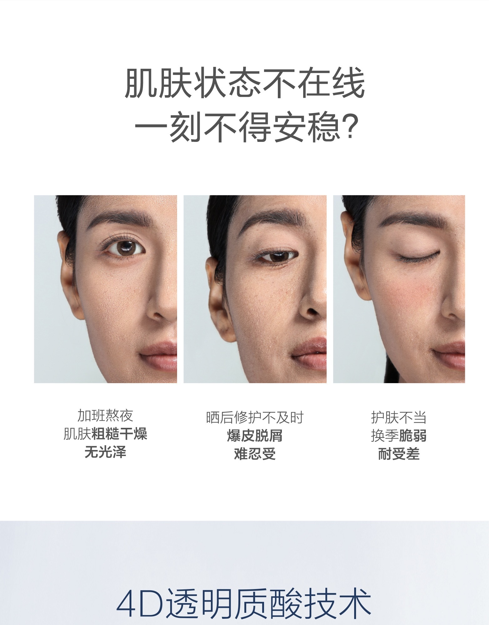 采用4D玻尿酸水活科技,精补水深锁水,快速击退干燥,焕活肌肤柔润水光。