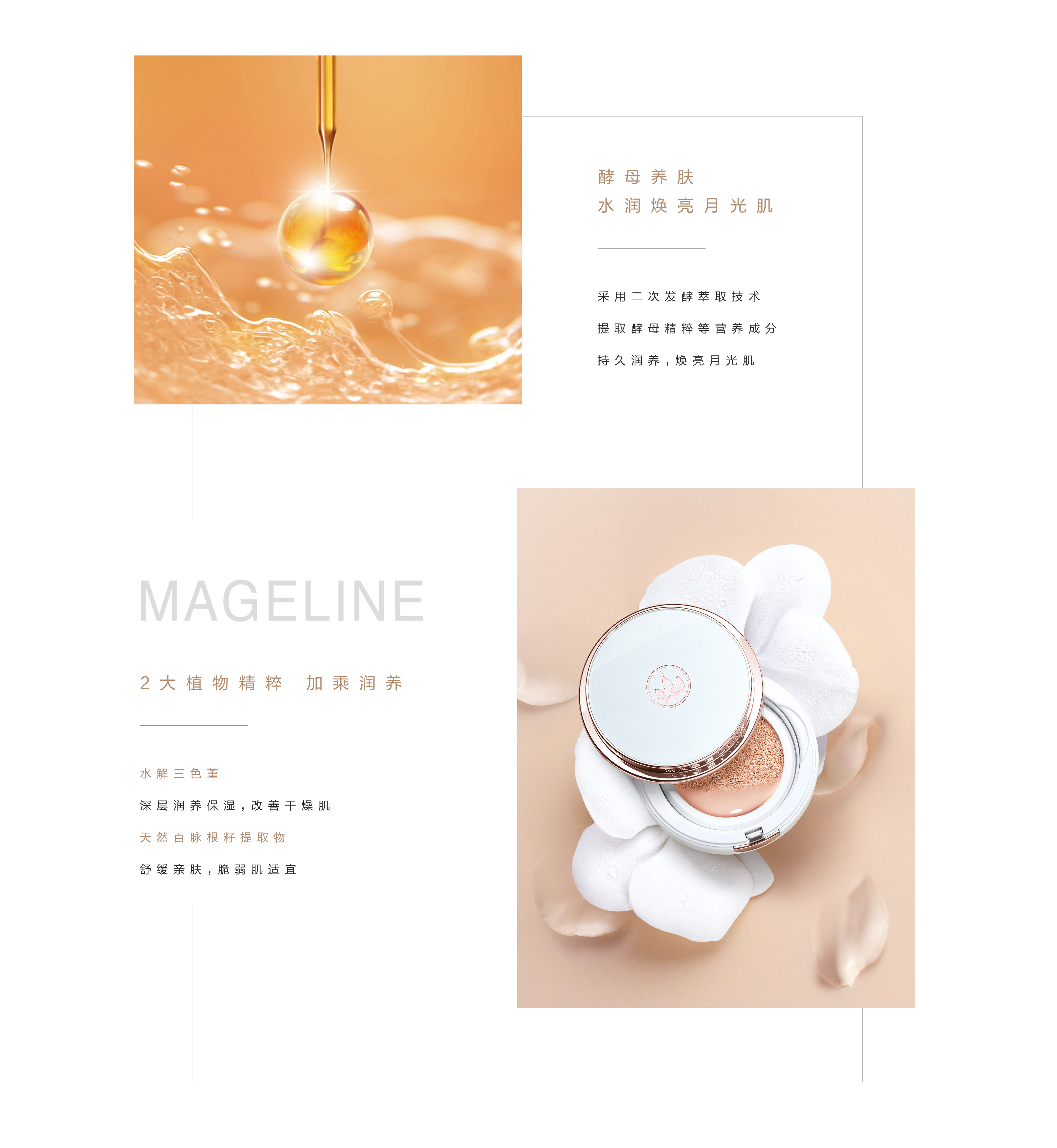 灵魂酵母入妆,内养肤外修颜. 润泽保湿,奢养呵护,柔光持久不暗沉. 裸感轻透,妆出细嫩光滑月光肌.