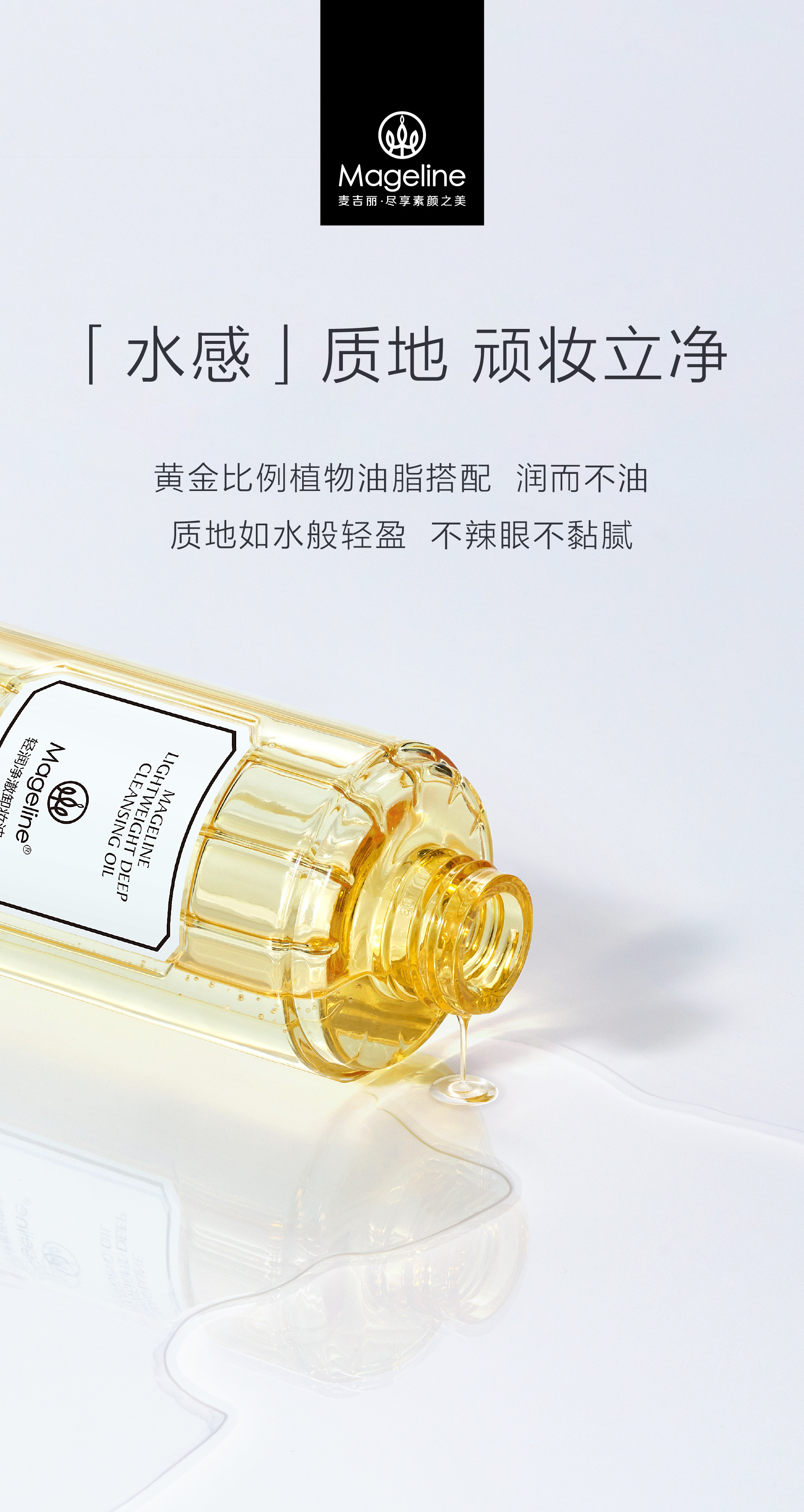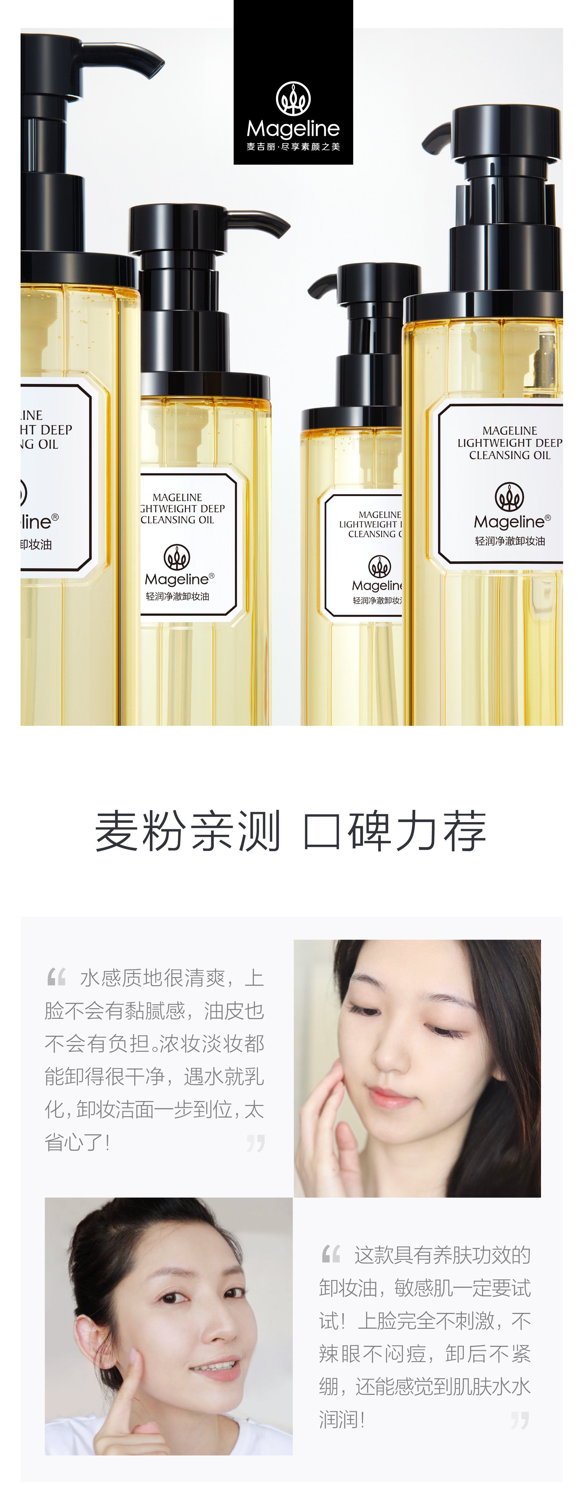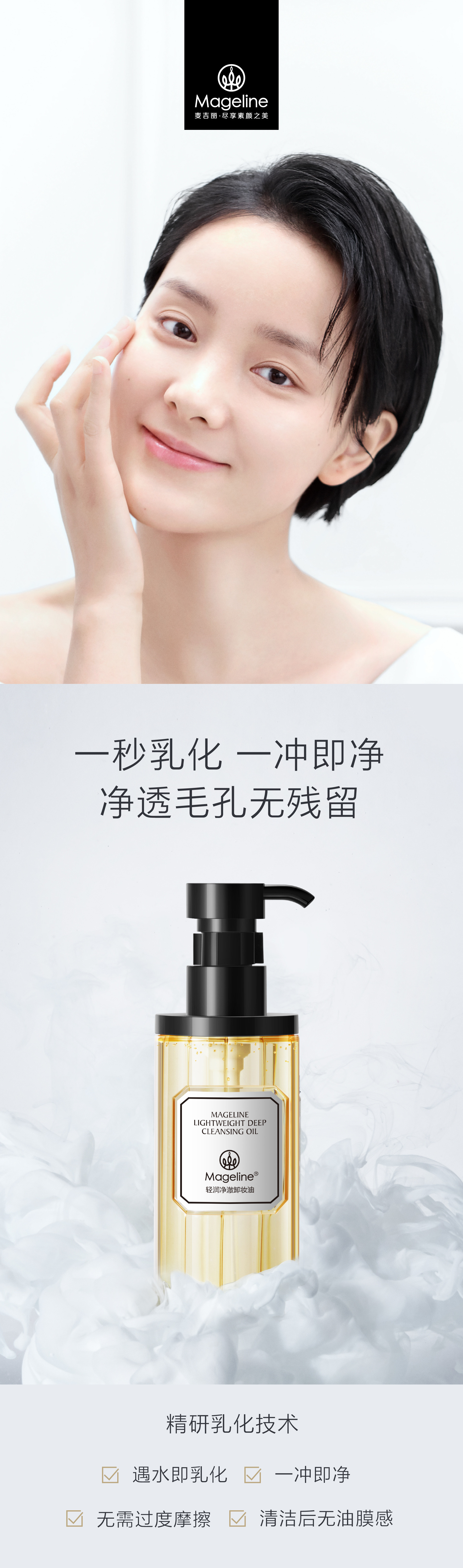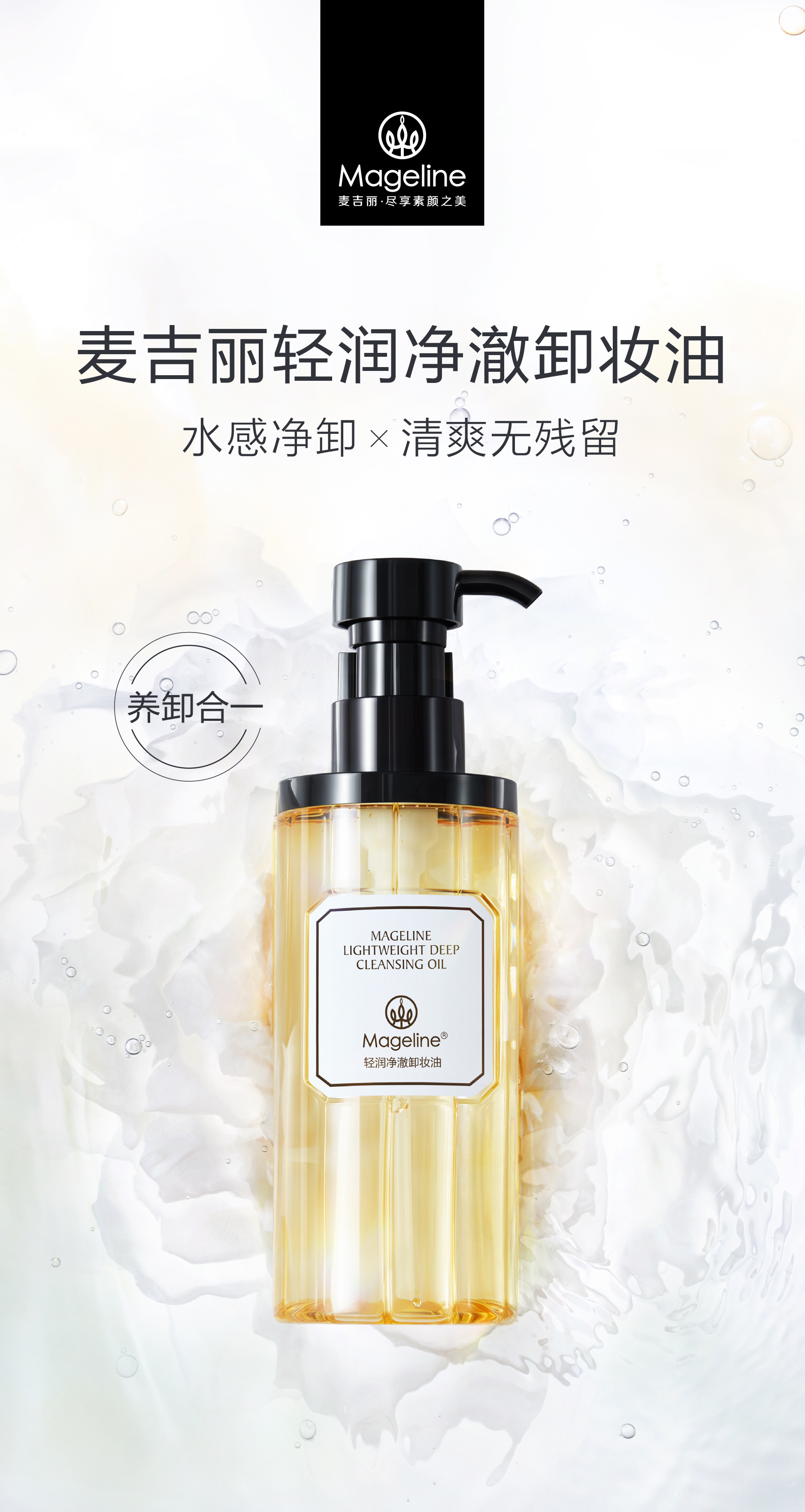 麦吉丽轻润净澈卸妆油 清爽水感质地,润而不油 特添加7大护肤精油和5大自然植萃,温和亲肤,保湿润泽,实力呵护肌肤皮脂膜,无惧干燥敏感,润养卸净不紧绷