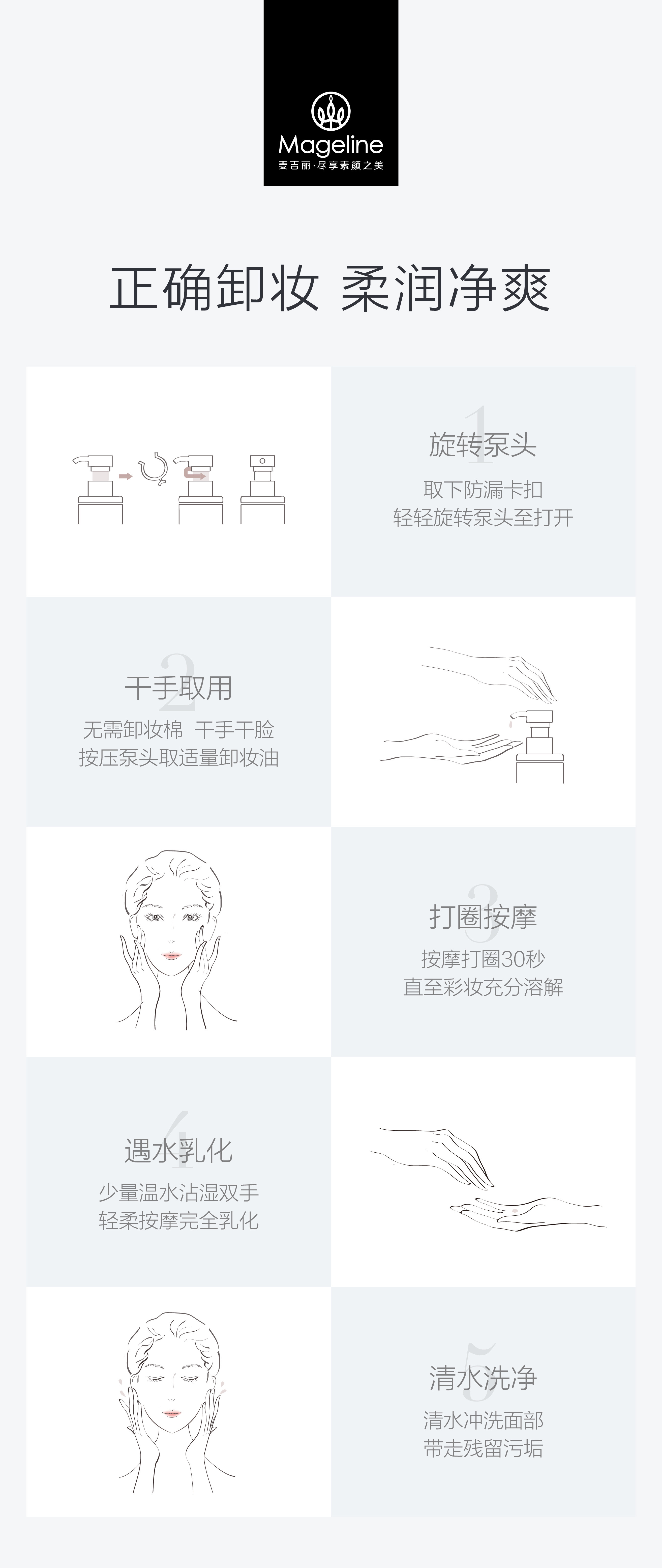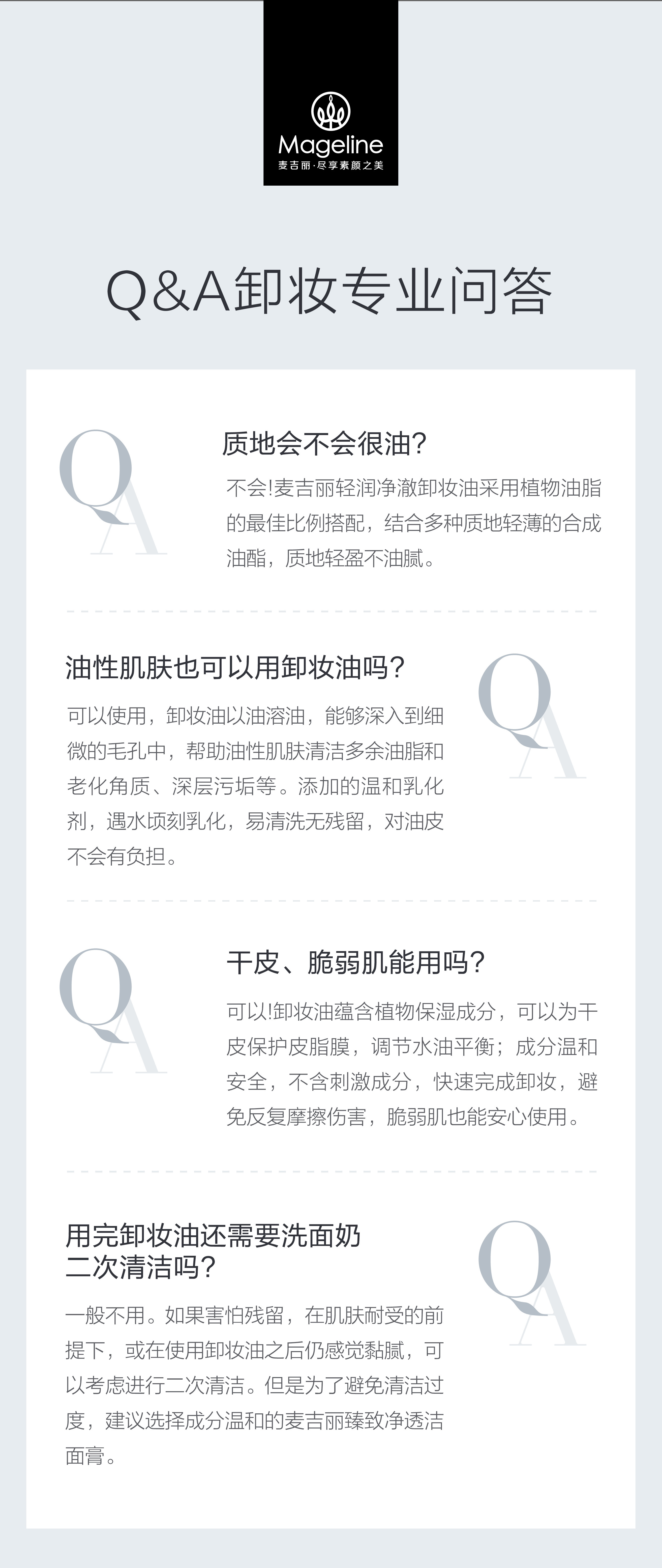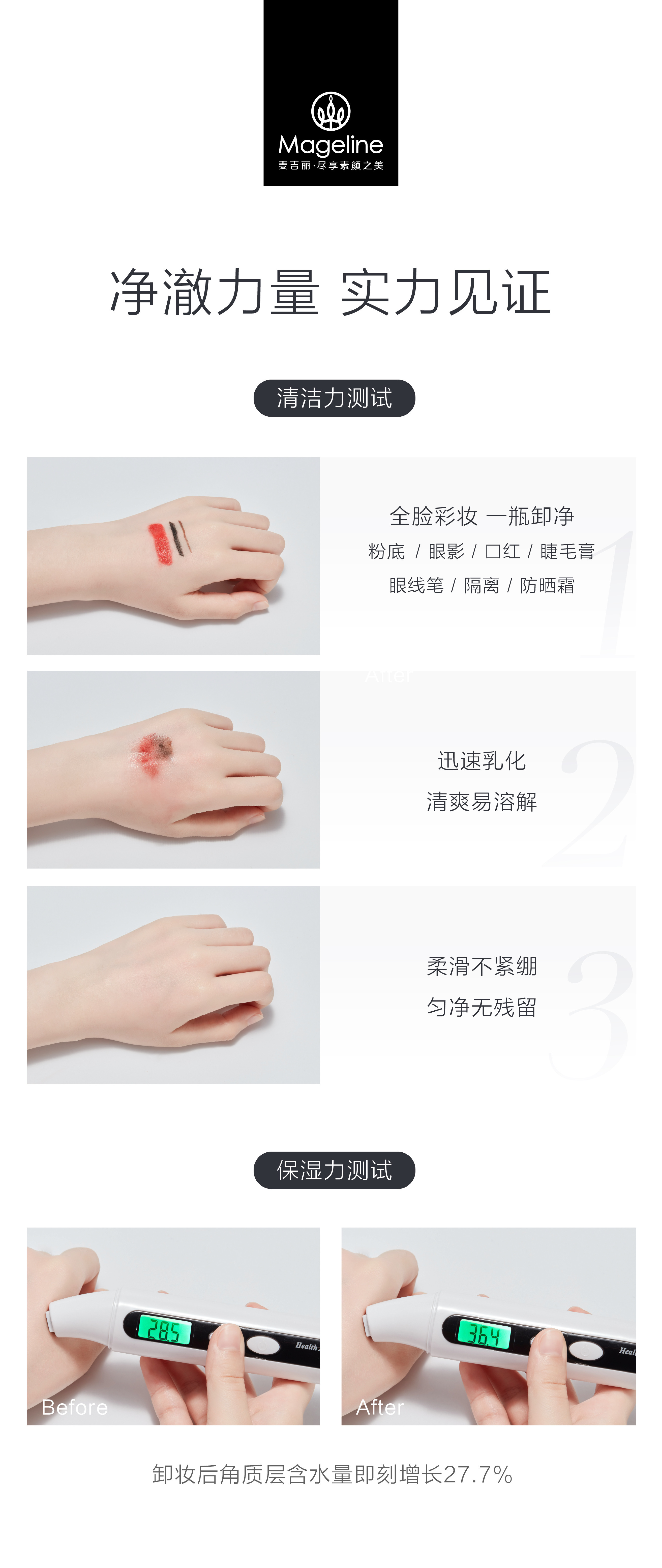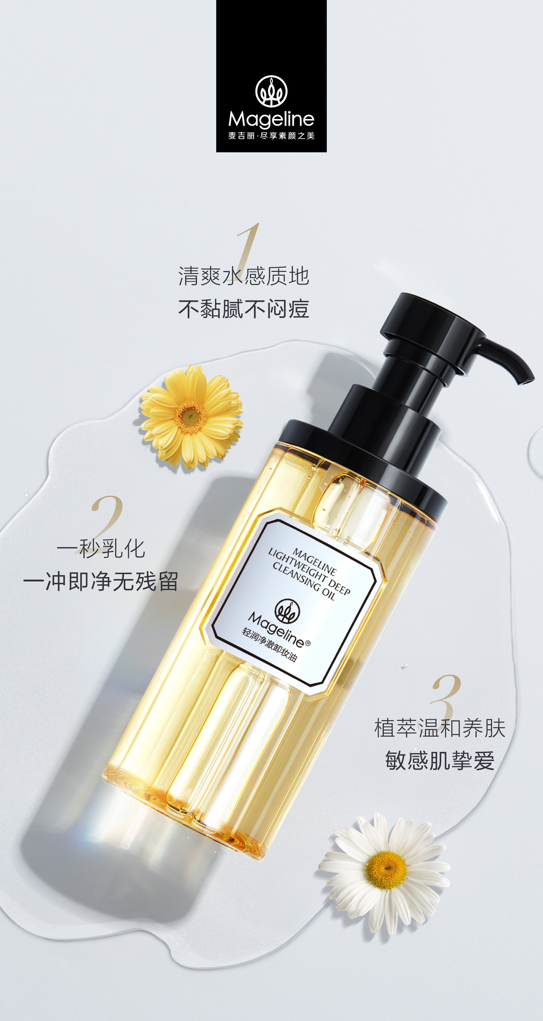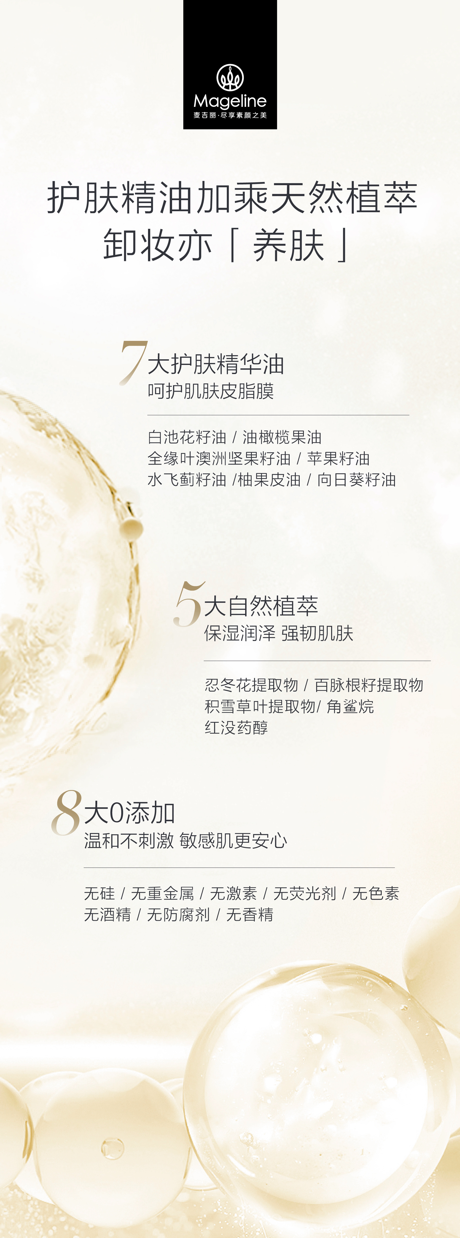 麦吉丽轻润净澈卸妆油 清爽水感质地,润而不油 特添加7大护肤精油和5大自然植萃,温和亲肤,保湿润泽,实力呵护肌肤皮脂膜,无惧干燥敏感,润养卸净不紧绷
