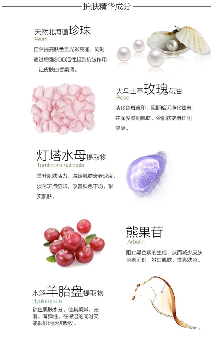 甘油、人参(Panax Ginseng)根提取物、水解珍珠、、解胎盘(羊)提取物、明质酸钠、熊果苷、水解胶原、角鲨烷、生育酚(维生素E)、羊毛脂、荟提取物、甘草(Glycyrrhiza Uralensis)提取物、水母提取物、玫瑰(Rosa Rugosa)花油等。