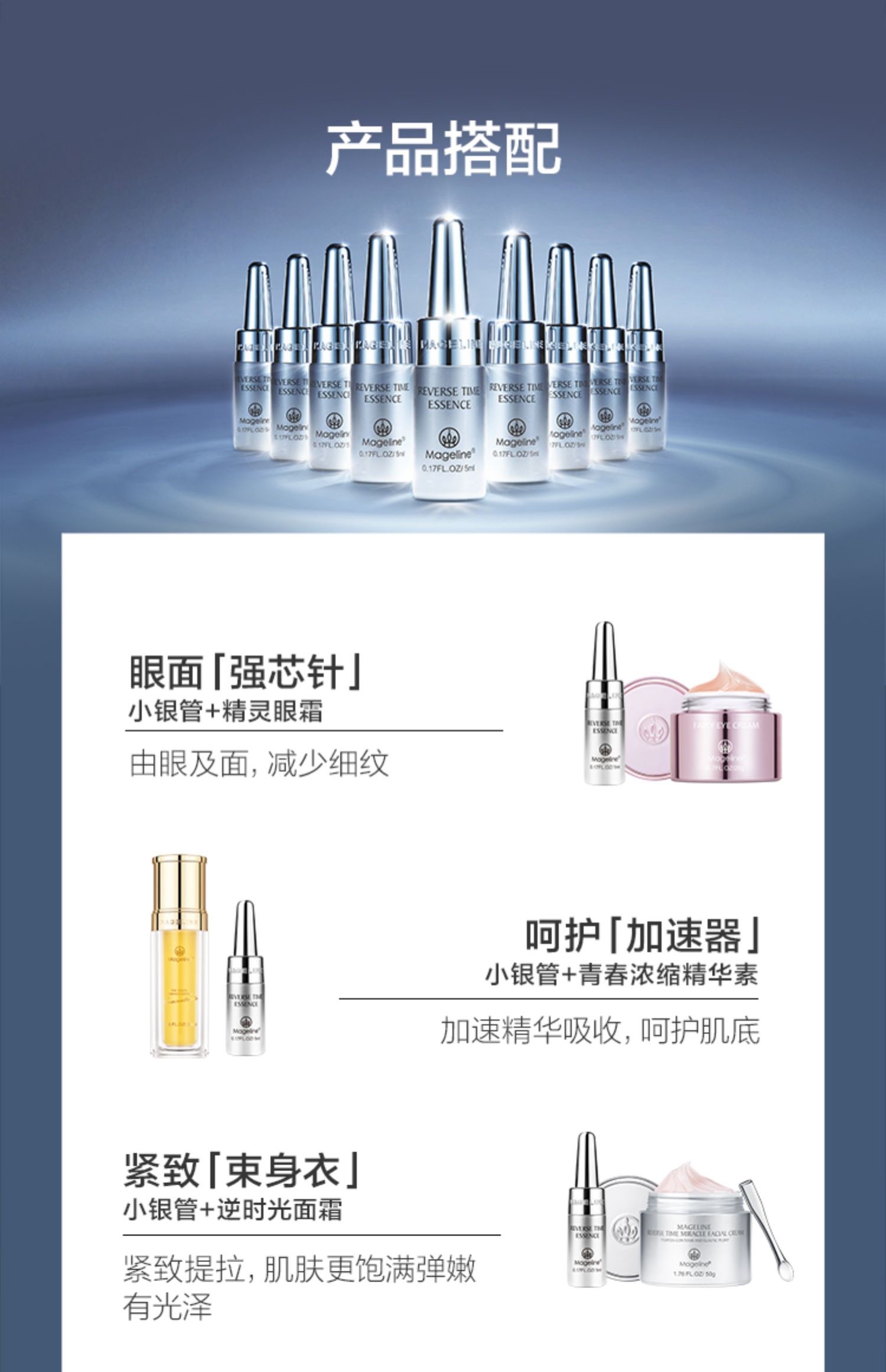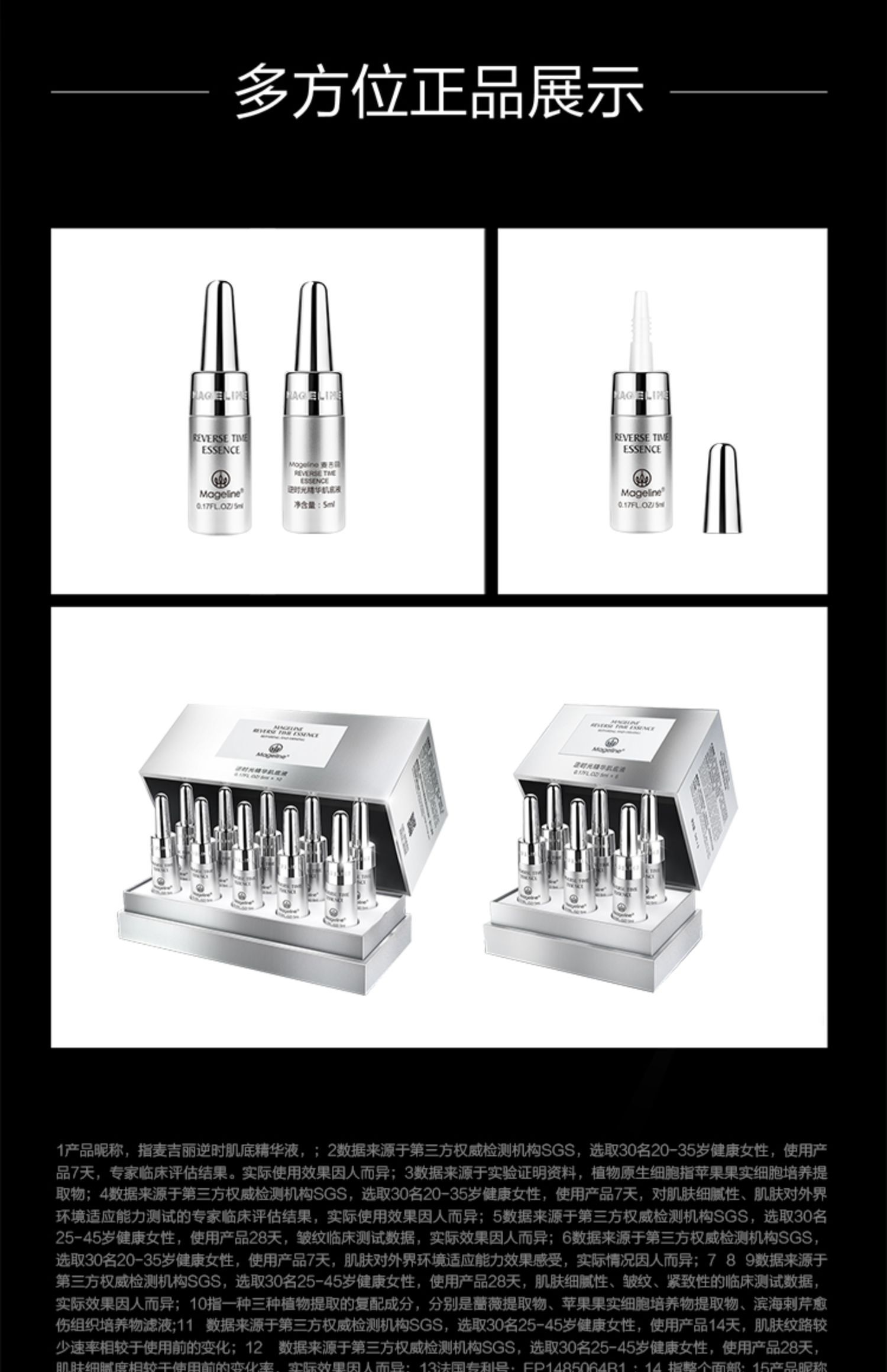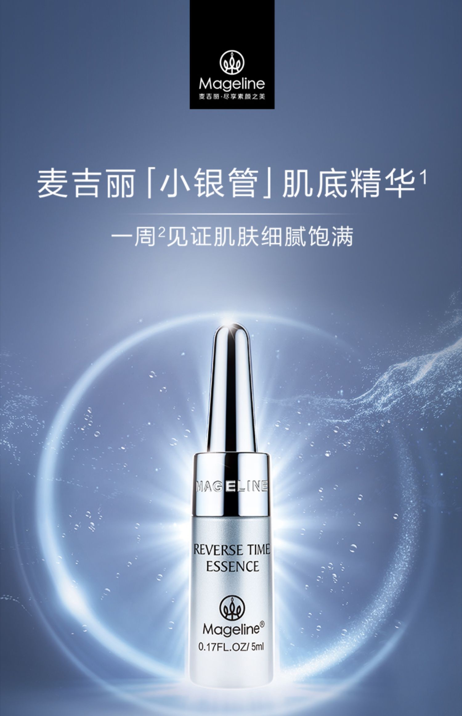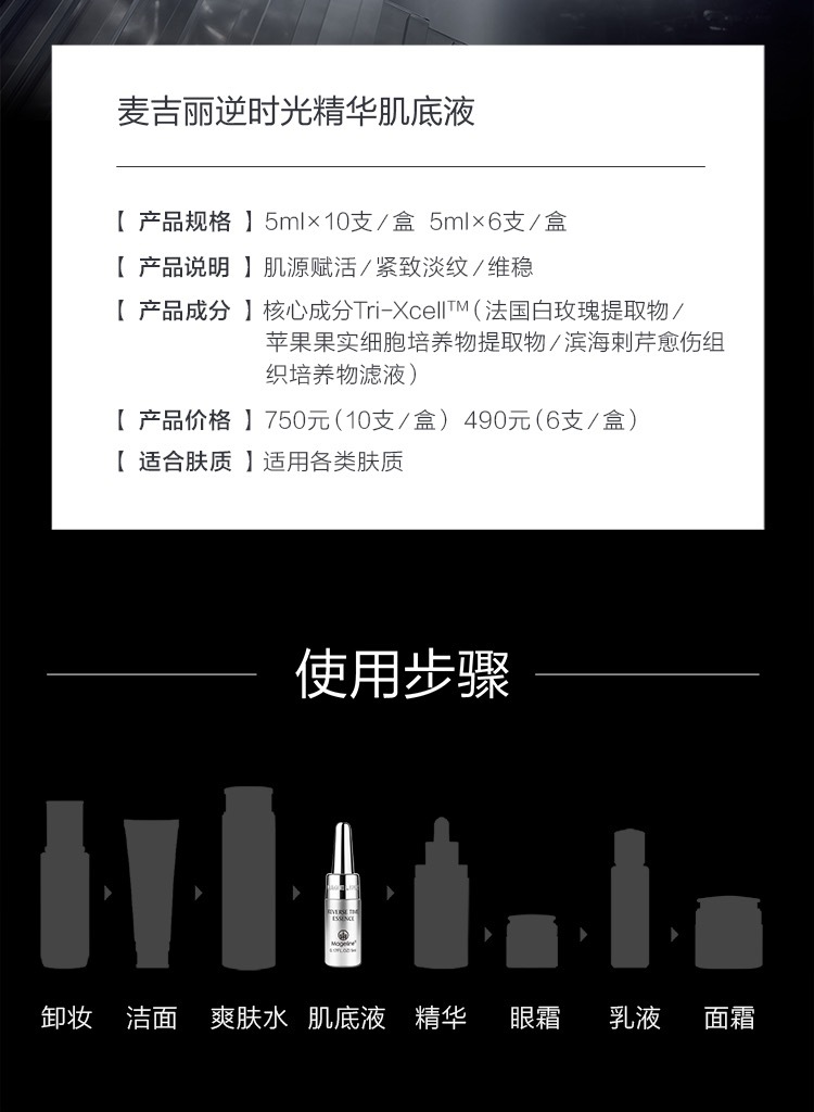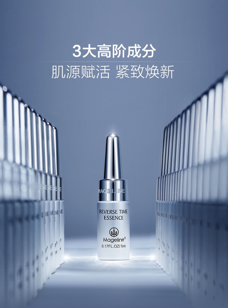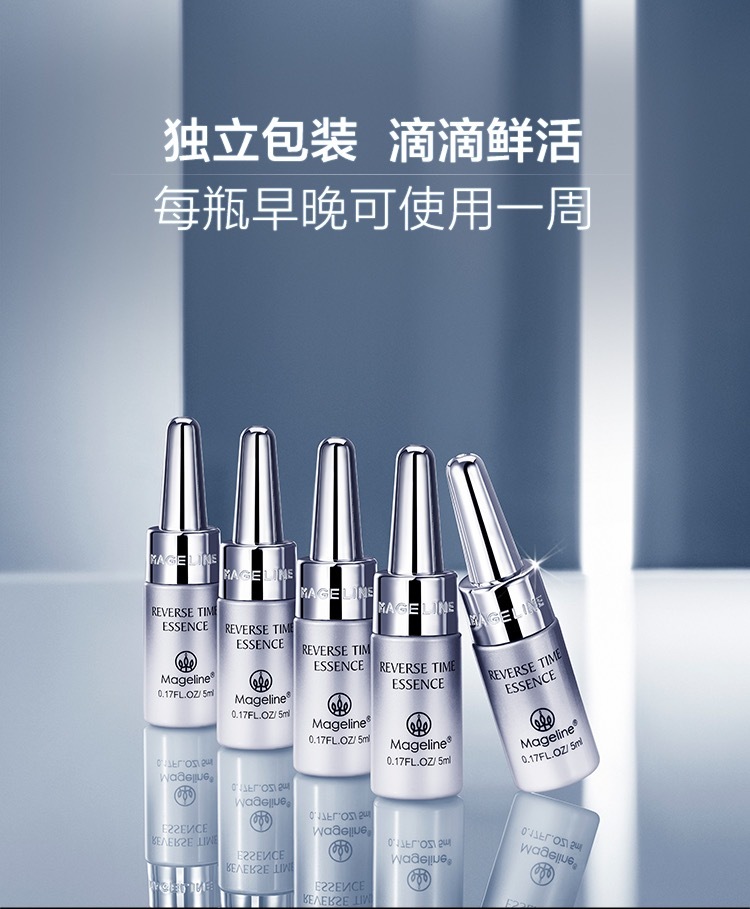 麦吉丽逆时光精华肌底液, C位出道麦吉丽小银管,一周见证肌肤细腻饱满, 鲜活直达肌底,滴滴修护年轻, 肌肤抗老专利黑科技Tri-X Cell™, 不含防腐剂, 平衡肌底微生态,更鲜活更紧致. 高效抗氧化,提亮肤色,修复受损细胞,促进胶原蛋白再生