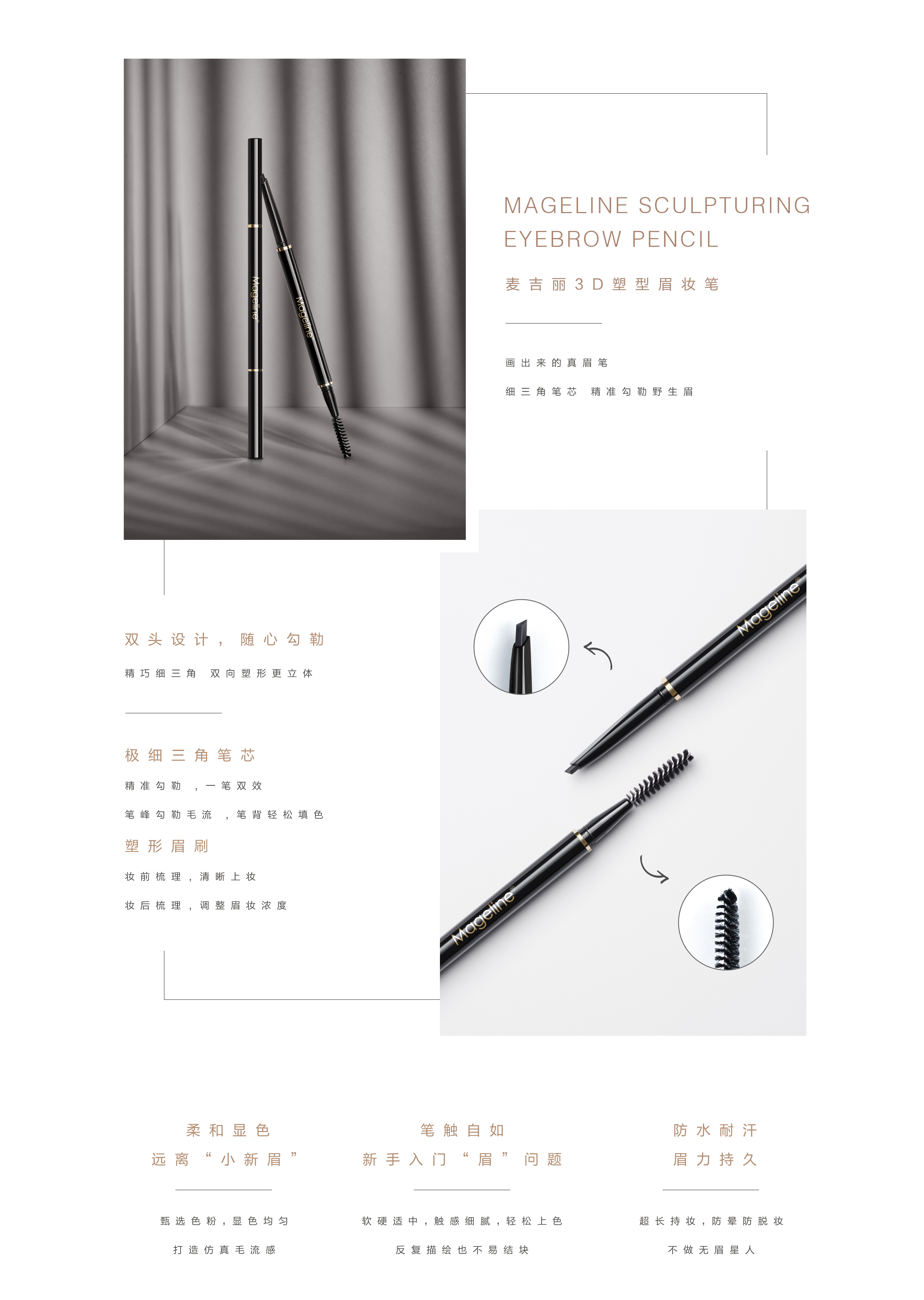 极细三角笔芯搭配塑形眉刷,梳理勾勒一步到位