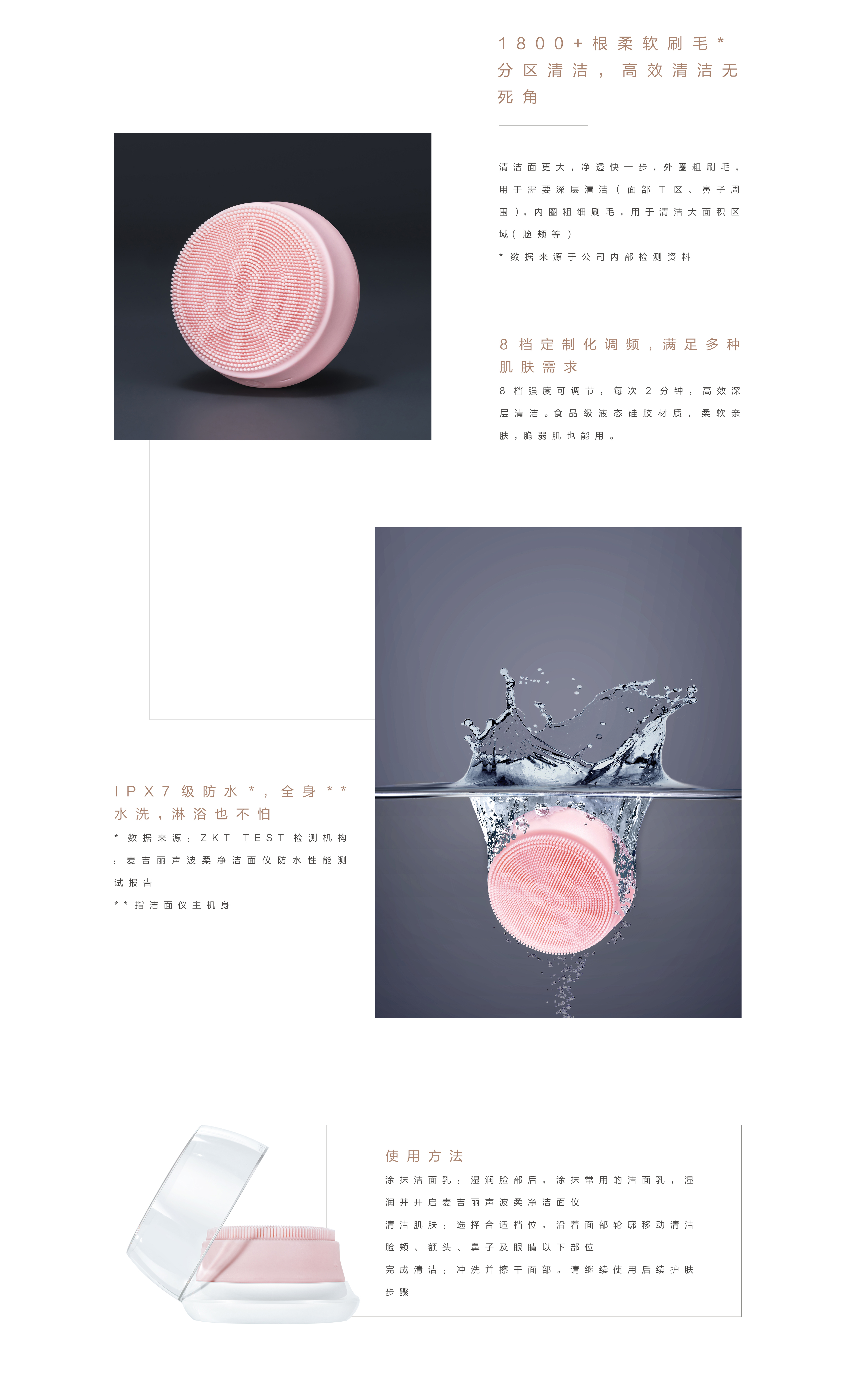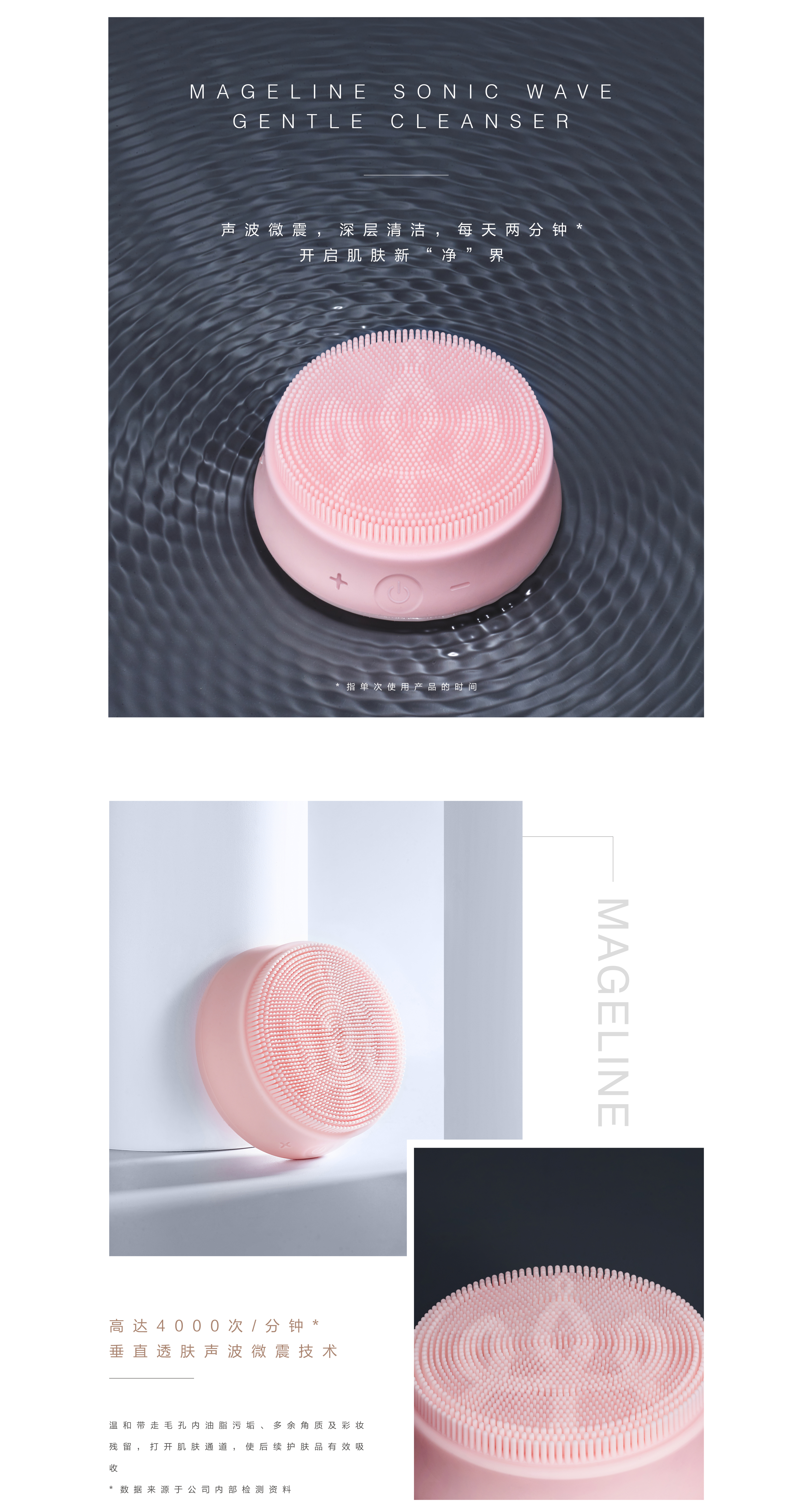 采用垂直透肤声波微震技术,高达4000次/分钟,1800+根柔软刷毛,分区清洁,高效洁面无死角。温和带走毛孔内油脂污垢,多余角质及彩妆残留,打开肌肤通道,使后续护肤品有效吸收。 每次2分钟,8档定制化调频,满足多种肌肤需求