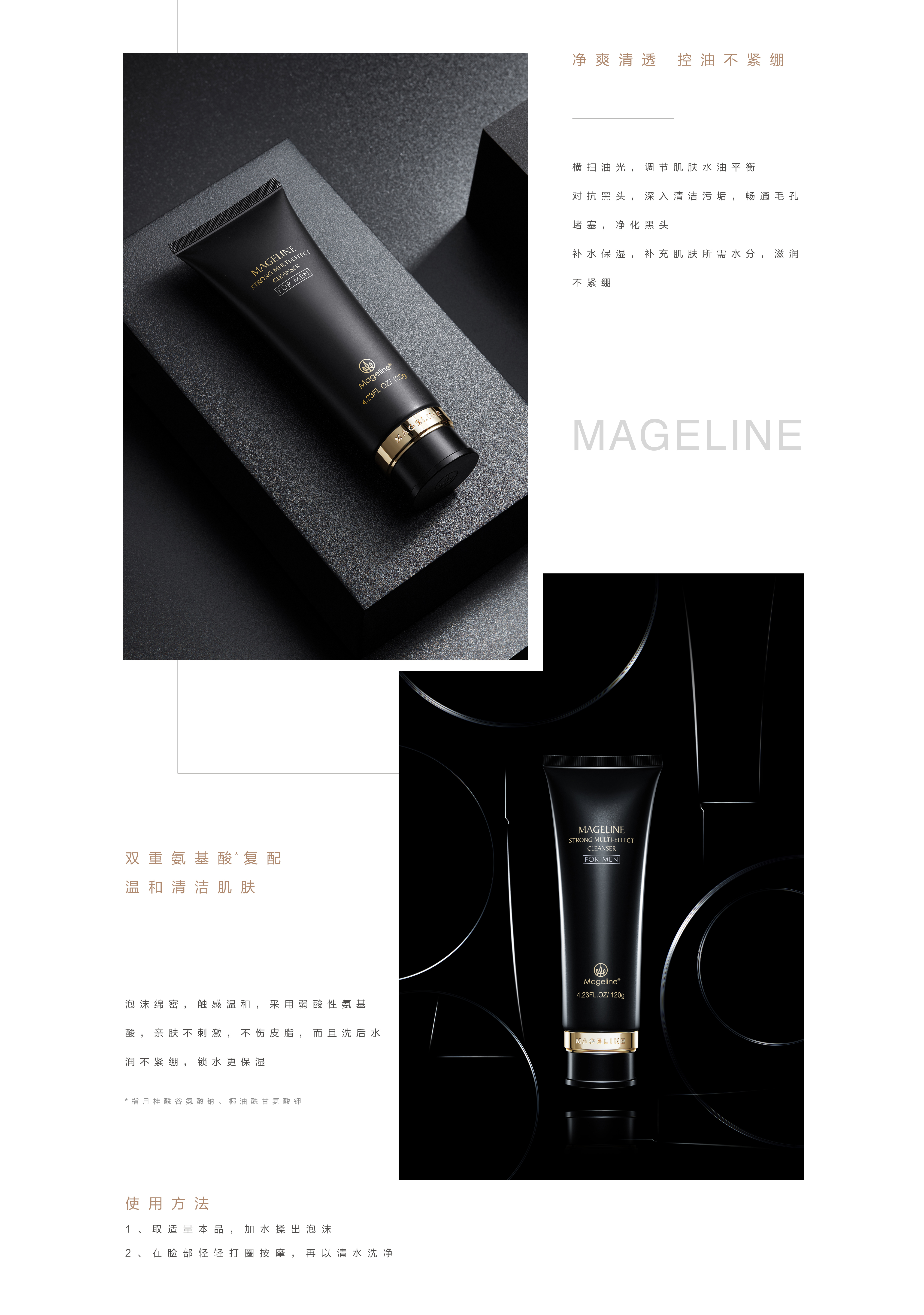 双重氨基酸复配成分搭配天然植萃精华,温和祛除污垢和老废角质,深层清洁肌肤,击退油光,对抗黑头,丰富绵密的泡沫,水润不紧绷,锁水更保湿,加倍呵护升级!给肌肤强劲苏醒, 型男必备.